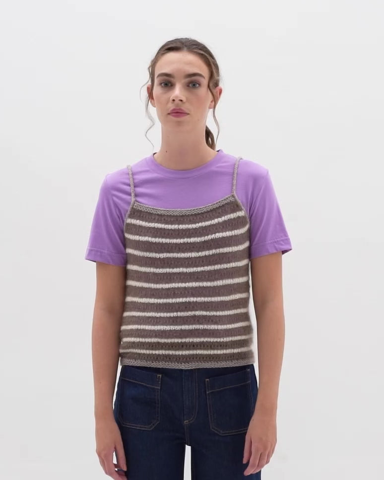 Den feminine Fejan Top kan du bruge udover en enkel T-shirt eller en festlig skjorte. Toppen strikkes nedefra og op i tre garnkvaliteter: Alpaca, Kid Mohair og Highland. Toppen har stropper med en I-cord, som giver den en flot afslutning og ekstra raffinement.