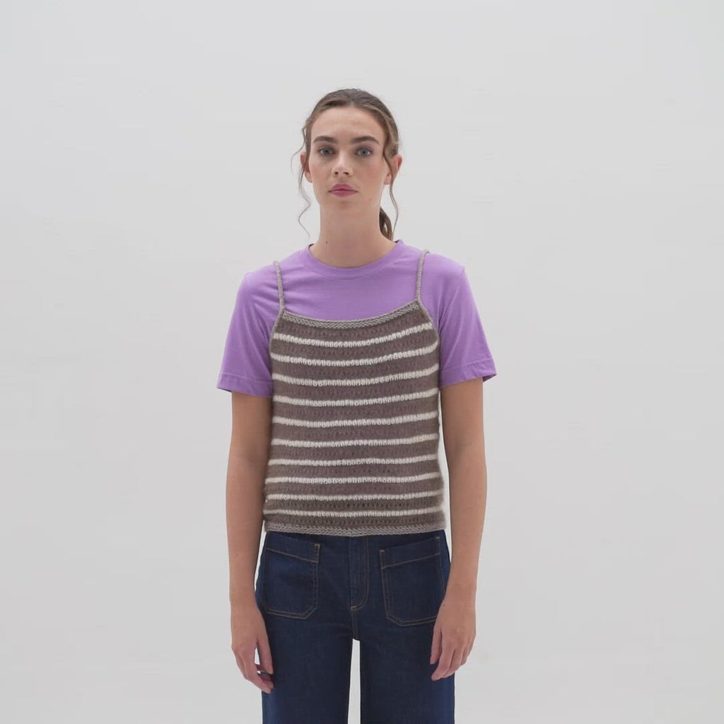 Fejan Top strikkes rundt nedefra og op. Kanten forneden strikkes i Highland, hvorefter der strikkes striber og struktur i henholdsvis Kid Mohair og Alpaca. Toppen afsluttes med retriller i Highland samt I-cord langs ærmegab og som stropper.