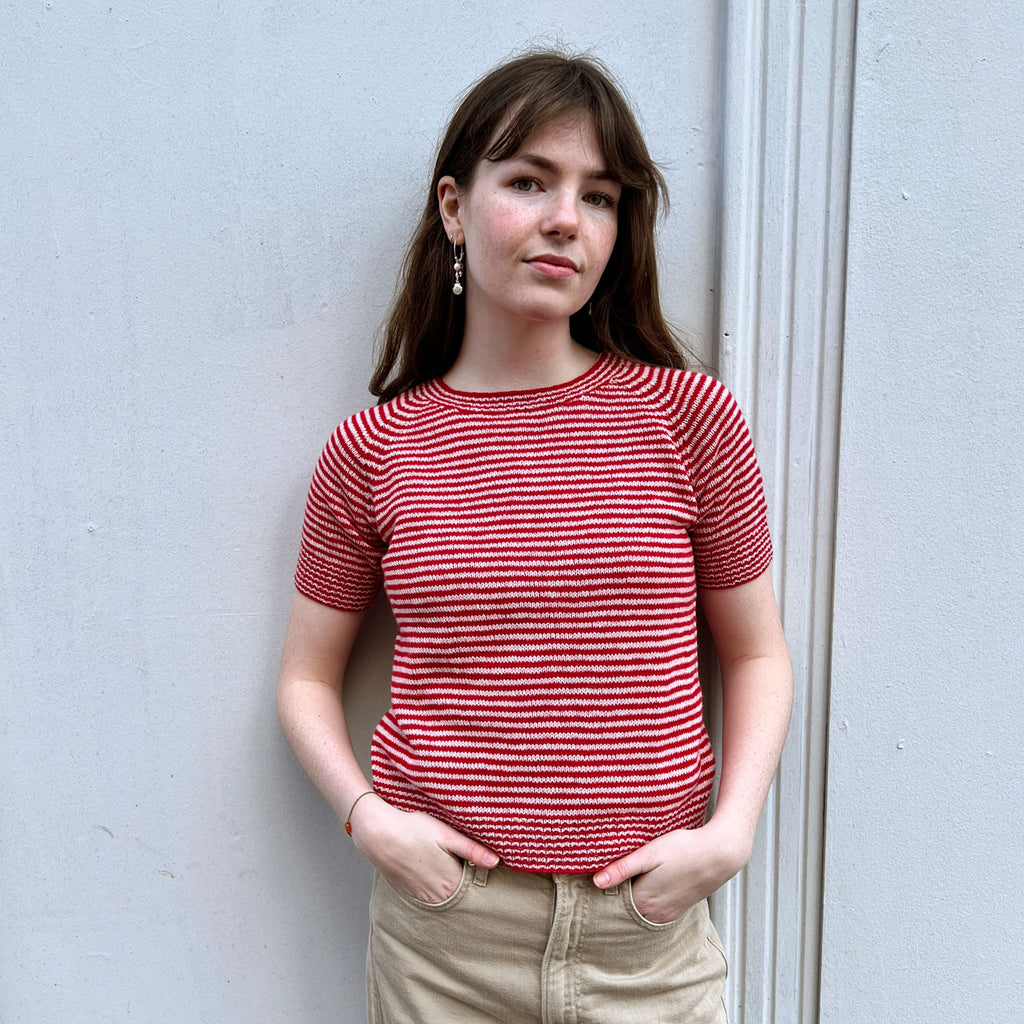 Esjan T-shirt strikkes i glatstrik nedefra og op. Kanterne strikkes i perlerib. Alt strikkes i smalle striber. Krop og ærmer strikkes hver for sig og samles til bærestykket, hvor der strikkes raglanindtagninger med en lille ribdetalje.