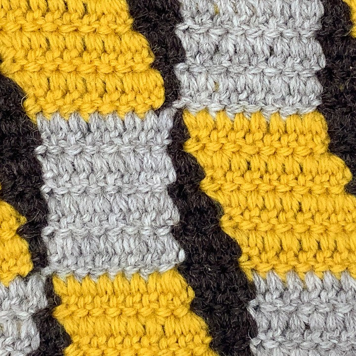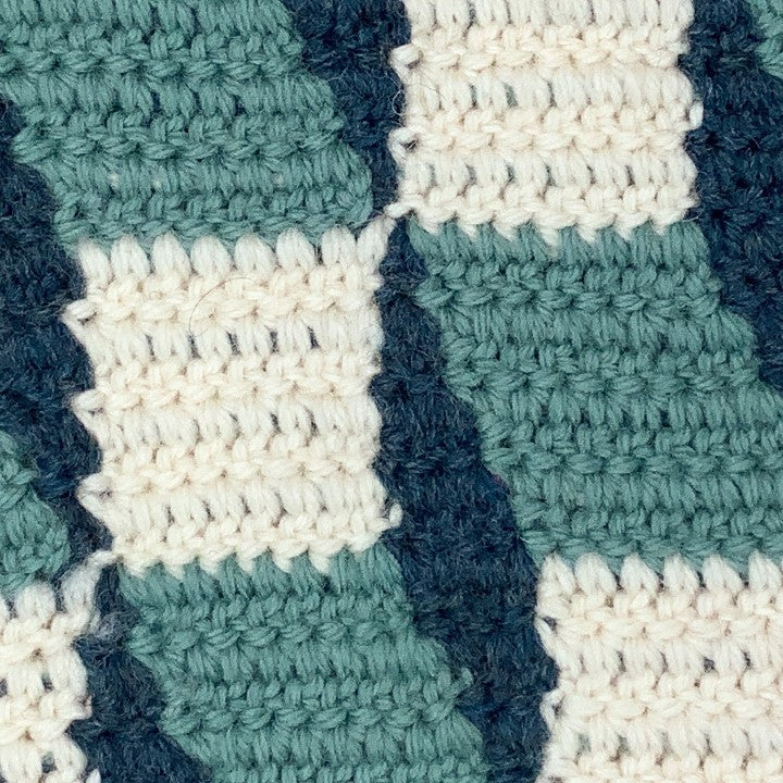 Kimito Taske hækles i vores Highland garn i 100% uld. Teknikken er flerfarve-hækling i stangmasker med ind- og udtagninger i mønstret og monteres med læderstropper og twillbånd på vrangsiden.