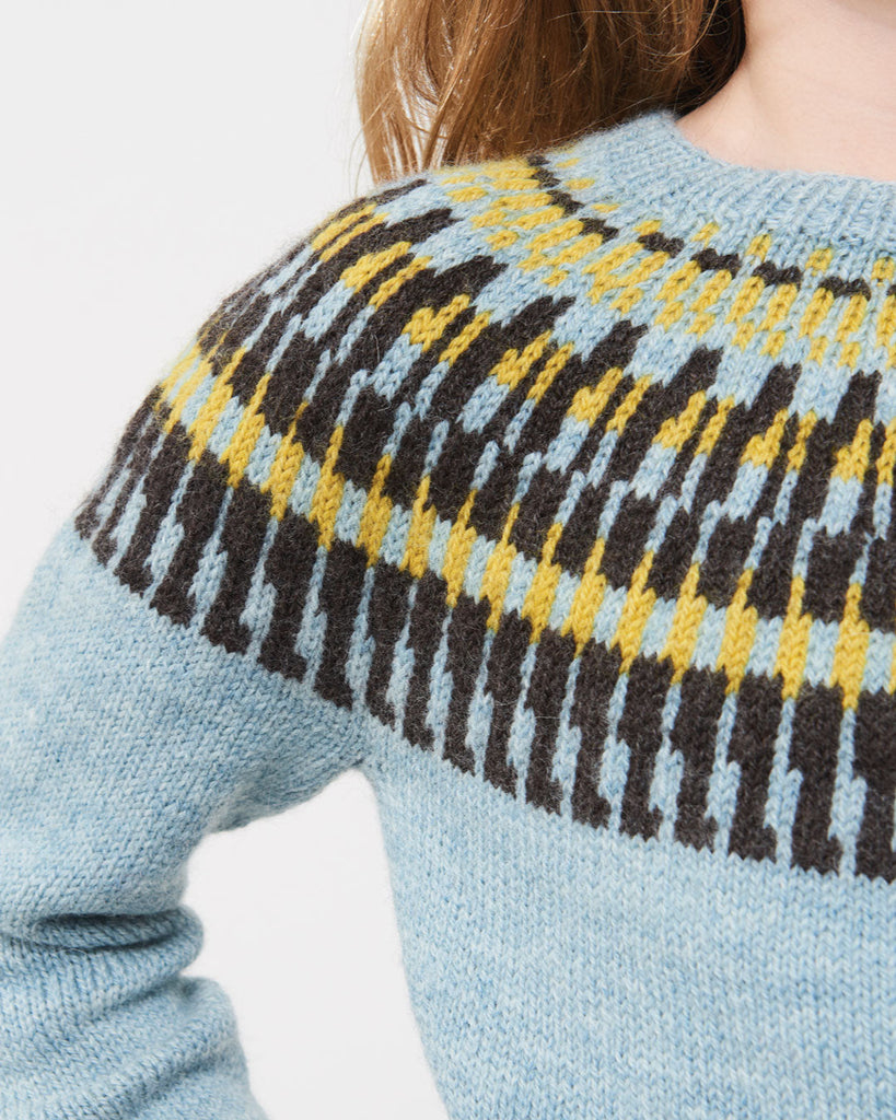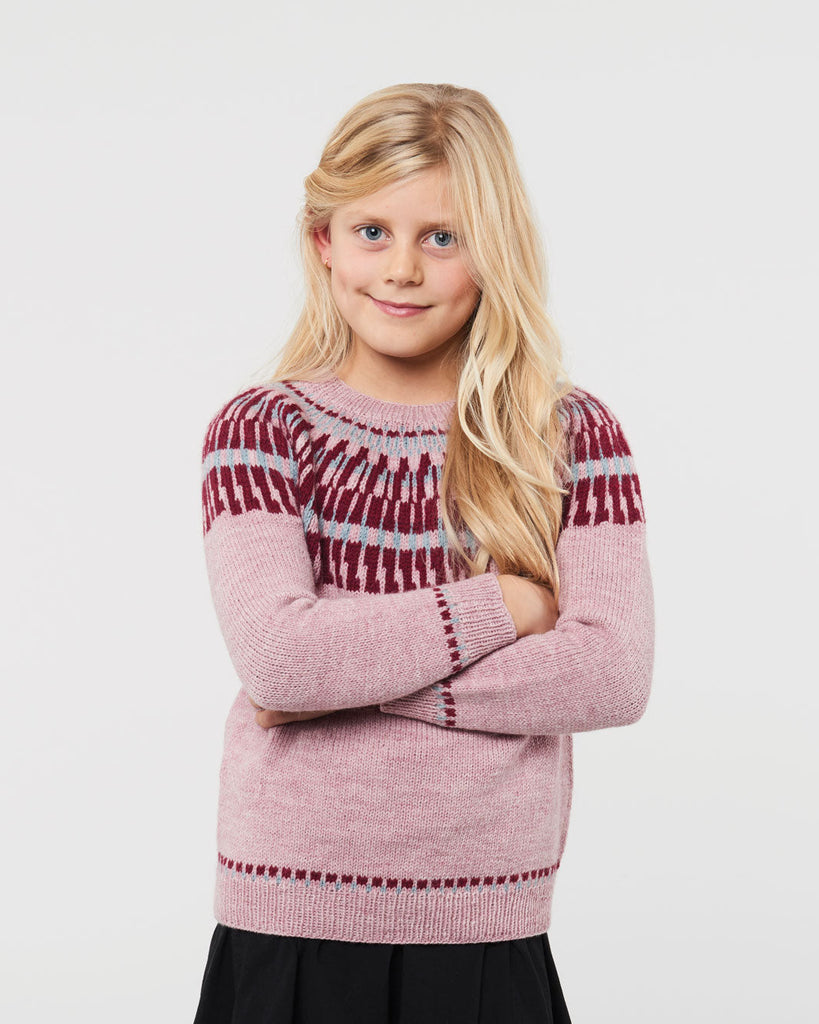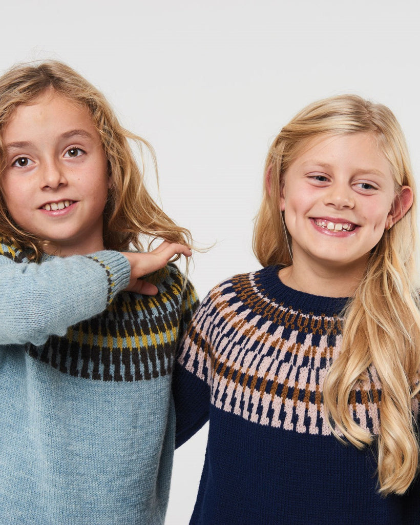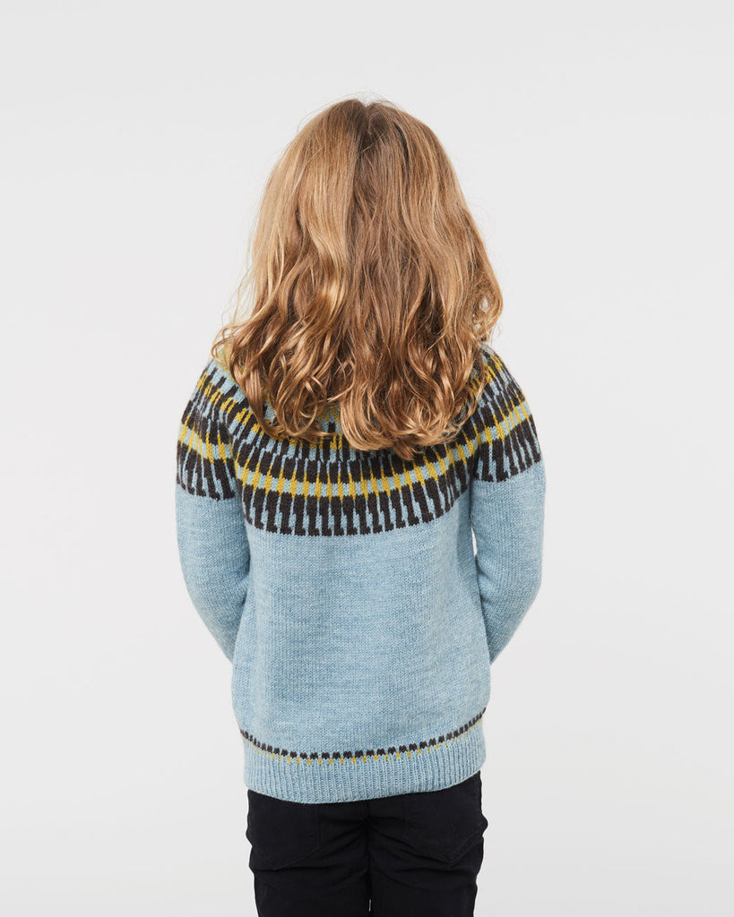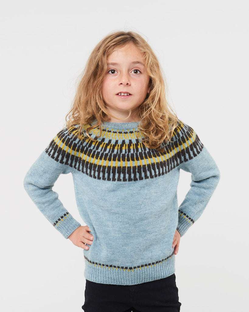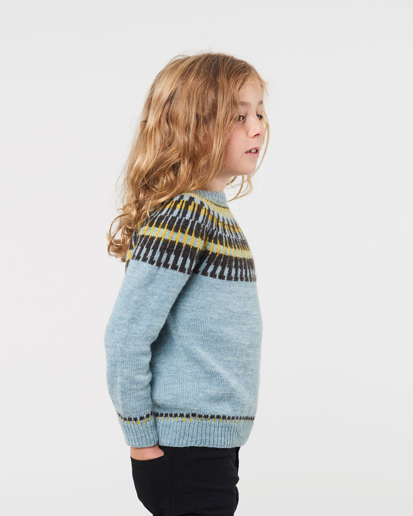 Røst Bluse til børn er inspireret af de ikoniske signatur sweatre fra Island med et markant og grafisk bærestykke. Røst fås i flere forskellige farvevarianter, som er inspireret af farveuniverset fra de traditionelle nordiske sweatre. Blusen strikkes i vores bløde Highland Mini i 100% uld.