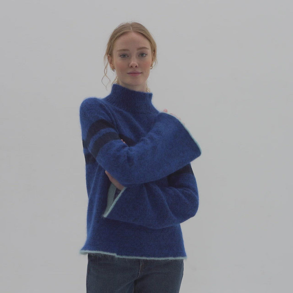 Denne elegante Enø Bluse er designet af Marianne Nørbo, som forener skønne farver, gode kvaliteter med en unik pasform. Blusen har brede ærmer, høj hals og elegante detaljer såsom foldede kanter, der strikkes med en smuk kontrastfarve. Enø strikkes med tre garntyper; Kid Mohair, Merino og Shiny Cotton, som tilsammen giver et sofistikeret look.