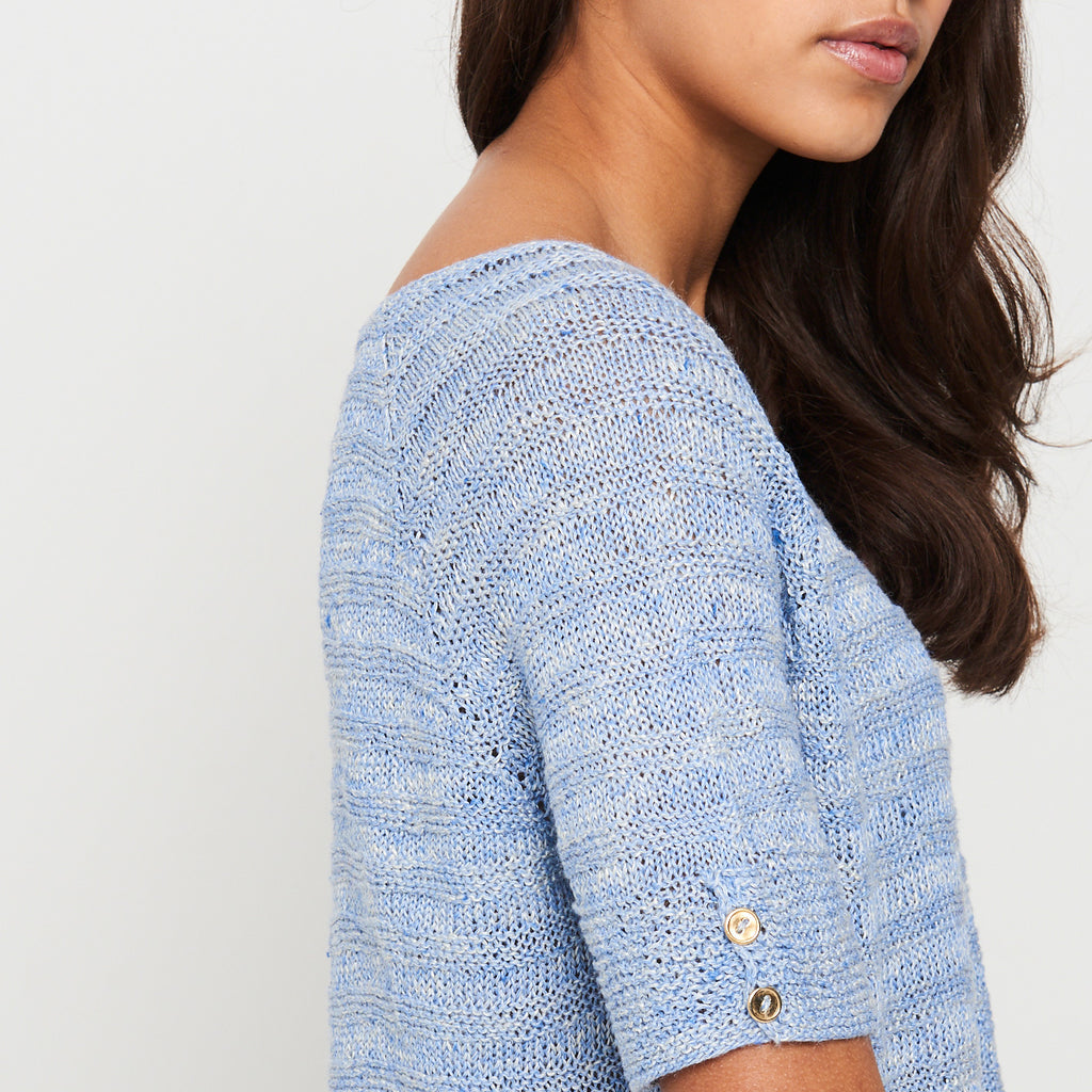 Ivö T-shirt strikkes nedefra og op i et simpelt rillemønster. Den enkle T-shirt har fine detaljer som slidser og manchetter monteret med små, gyldne knapper. Halsen afsluttes med en feminin slids samt guldknap midt bag.