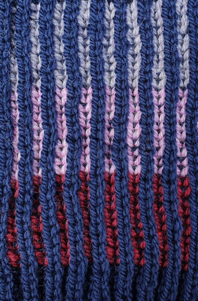 Karrat Sweater strikkes nedefra og op i tofarvet patent, mens halsen og ribkanterne strikkes i almindelig rib. Farve A er gennemgående i hele arbejdet, mens farve B, C og D danner sweaterens tre striber i den tofarvede patent. Bærestykket strikkes med indtagninger, og der afsluttes med en ombukket halskant i rib.