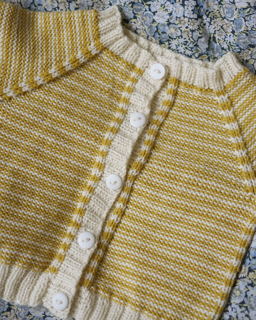 Cardiganen strikkes frem og tilbage med markeringer i glatstrik over to masker. Krop og ærmer strikkes hver for sig og samles ved bærestykket, hvor der tages ind til raglan. Sidst strikkes knapstolper i rib. Med i kittet følger naturligvis råhvide knapper, som sys i afslutningsvis.