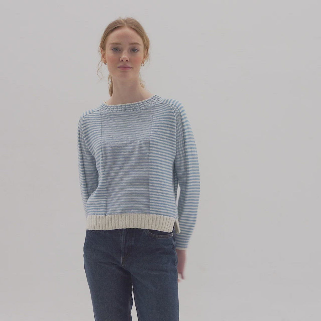 Striber giver altid et klassisk og sporty look - og er smart til et par jeans eller en nederdel. Strikketeknikken er en kombination af glatstrik og omvendt glatstrik, som tilsammen giver nogle fine strukturer. Anholt fås som t-shirt og slipover til damer samt bluse til damer og børn.