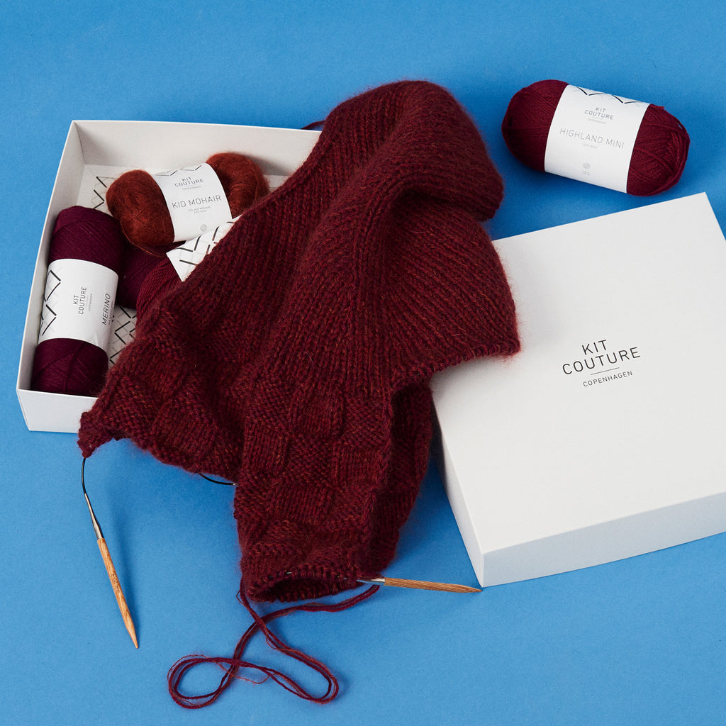Merino fra Kit Couture (50 g = 210 m) 250 (300) g Kid Mohair fra Kit Couture (25 g = 210 m) 125 (150) g Highland Mini fra Kit Couture (50 g = 175 m) 300 (350) g |