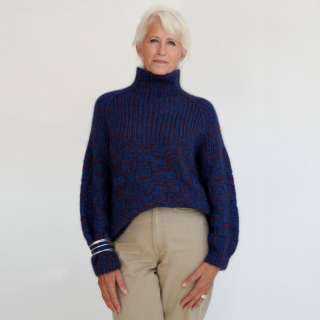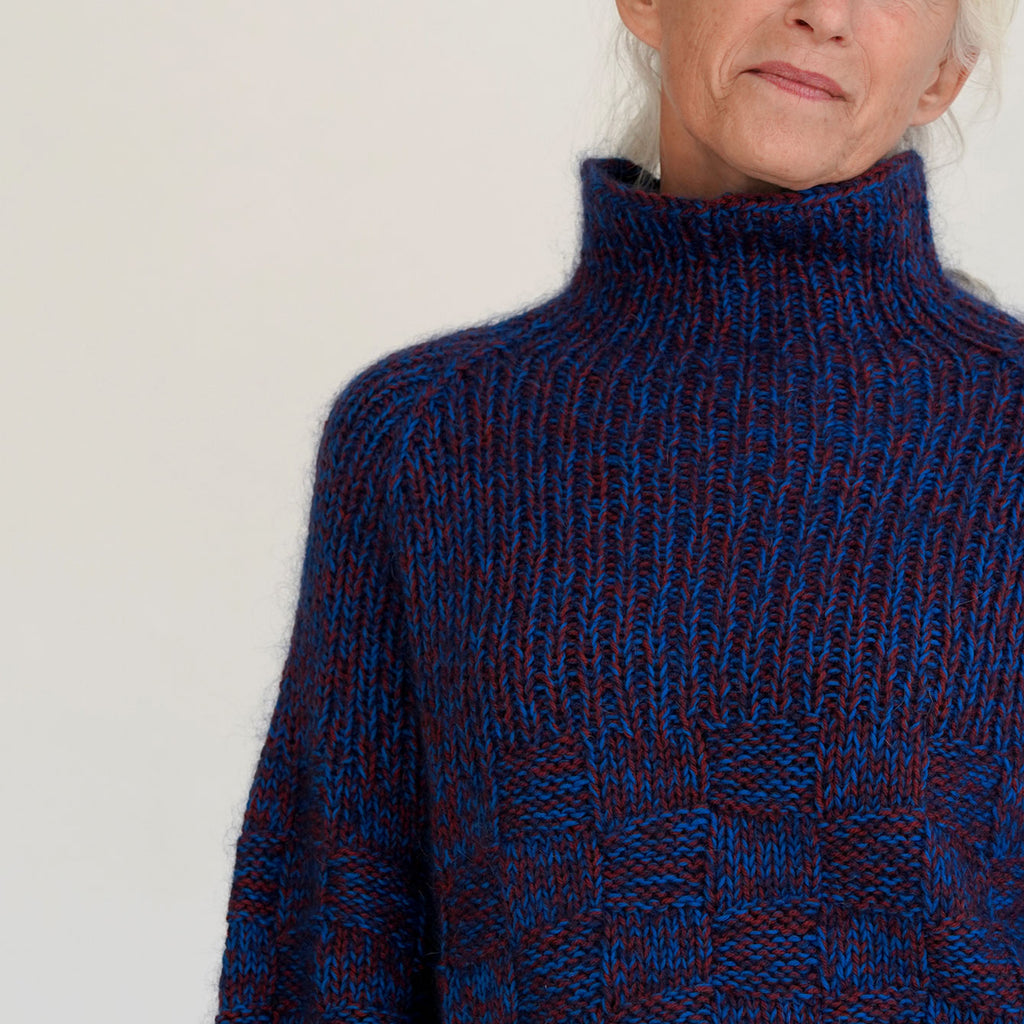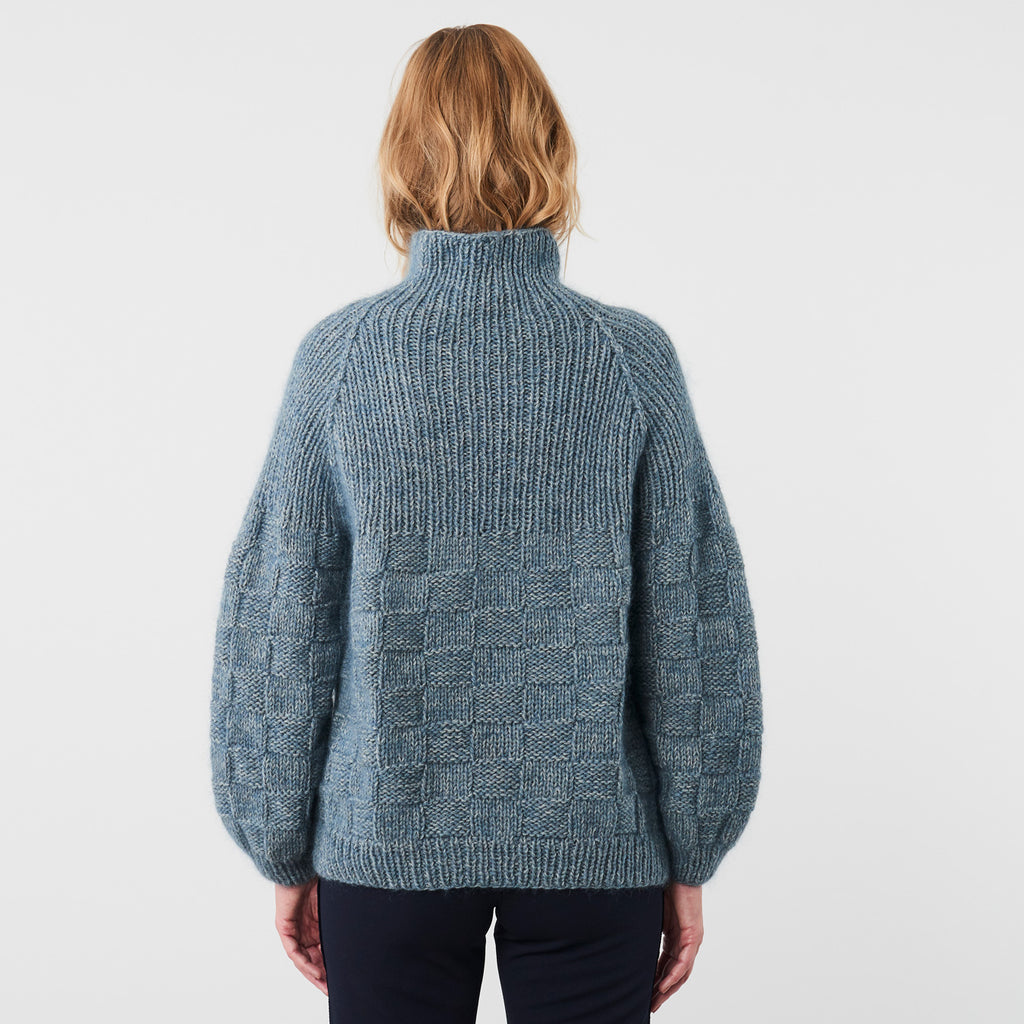 Aksø Sweater strikkes nedefra og op. De strikkede tern skabes med ret- og vrangmasker, mens kanter og bærestykket strikkes i rib. Krop og ærmer strikkes hver for sig og samles til bærestykket, hvor der tages ind til raglan med centrerede indtagninger.
