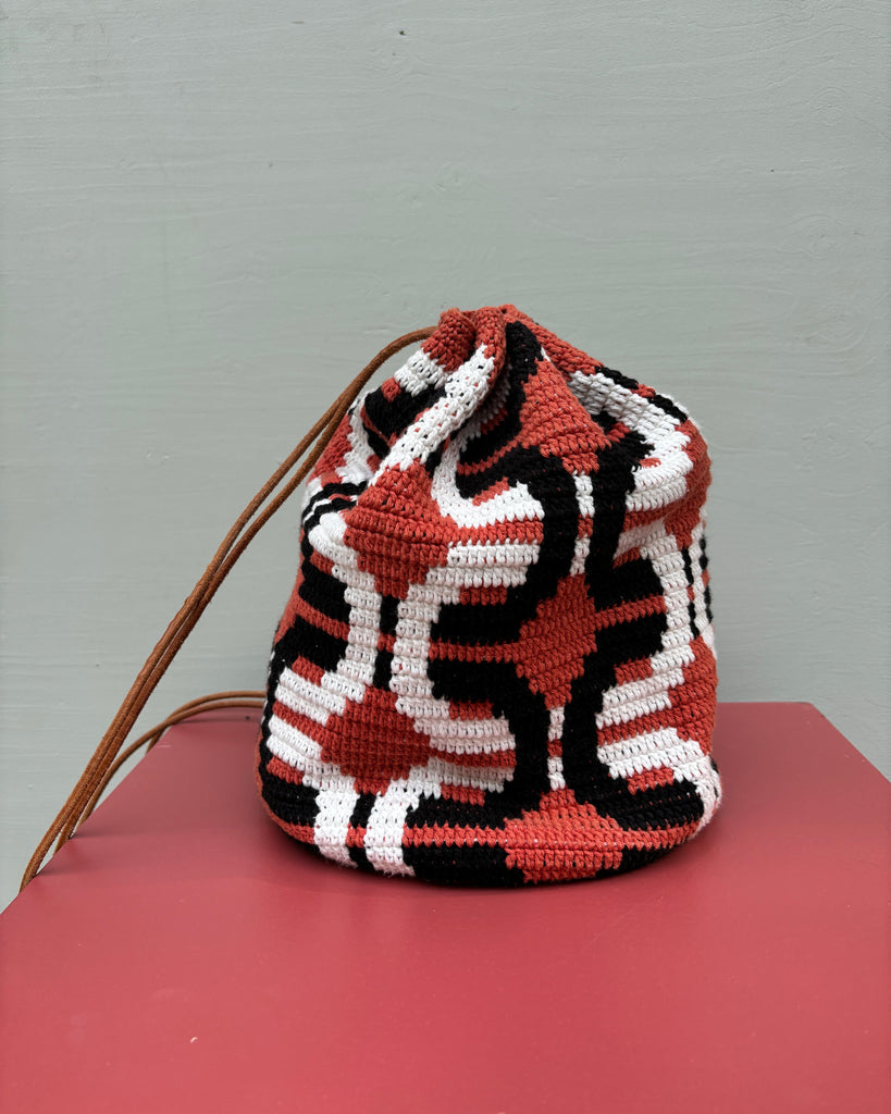 Teknikken er flerfarve-hækling i stangmasker, mens bunden hækles i fastmasker. Tasken hækles i vores 100% bomuldsgarn, og den monteres med en rem i kernelæder.
