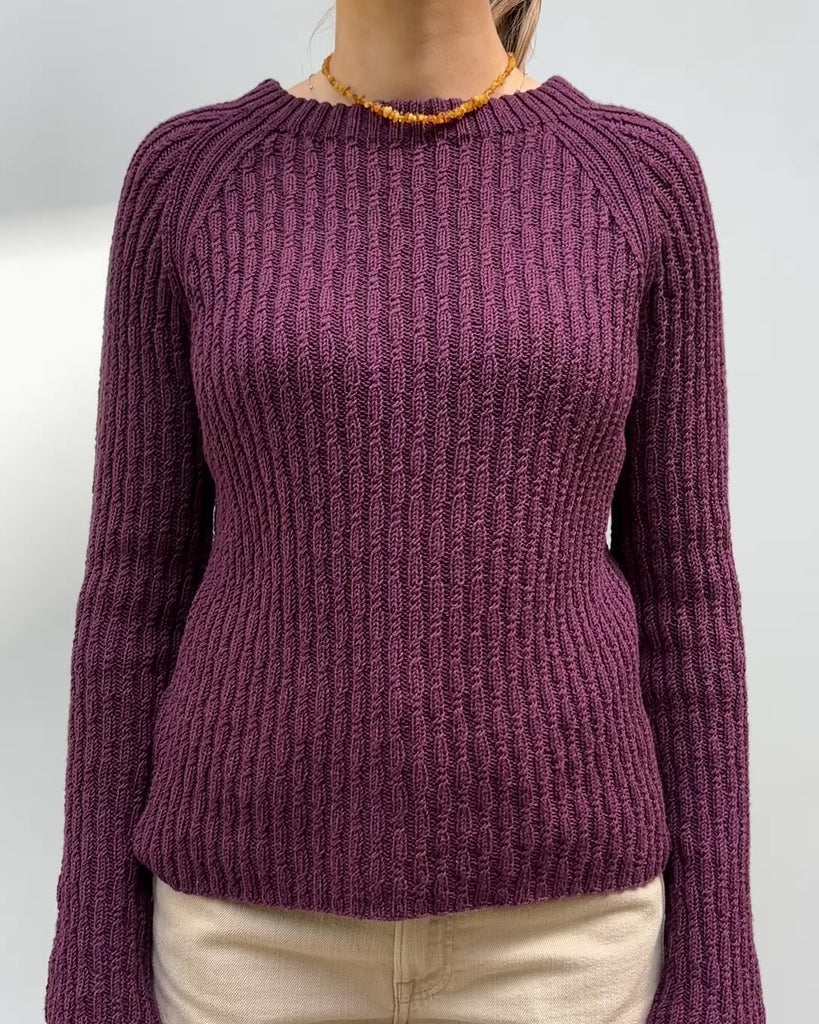 Sula Bluse strikkes rundt nedefra og op med et lille ribmønster med krydsede masker. Krop og ærmer strikkes hver for sig og samles til bærestykket, der strikkes med brede raglanmarkeringer.