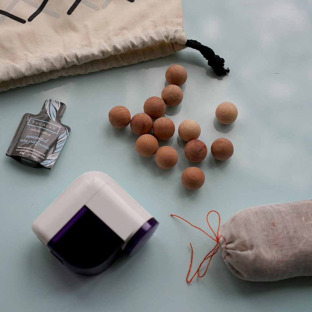 Derfor anbefaler vi, at du har enten cedertræskugler sprayet med cedertræsolie – eller en duftpose med cedertræ sammen med både dit garn og dit færdige strik for at holde de uønskede dyr væk.