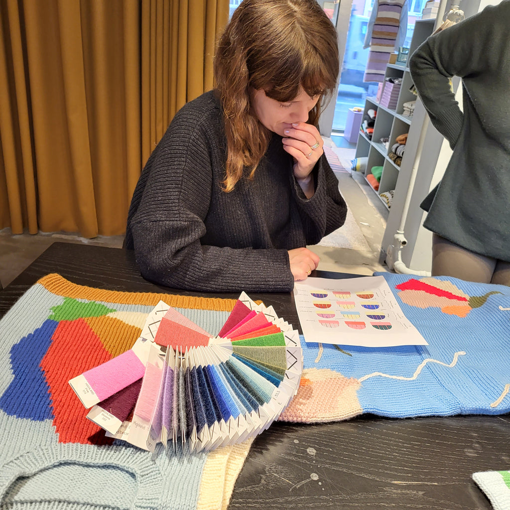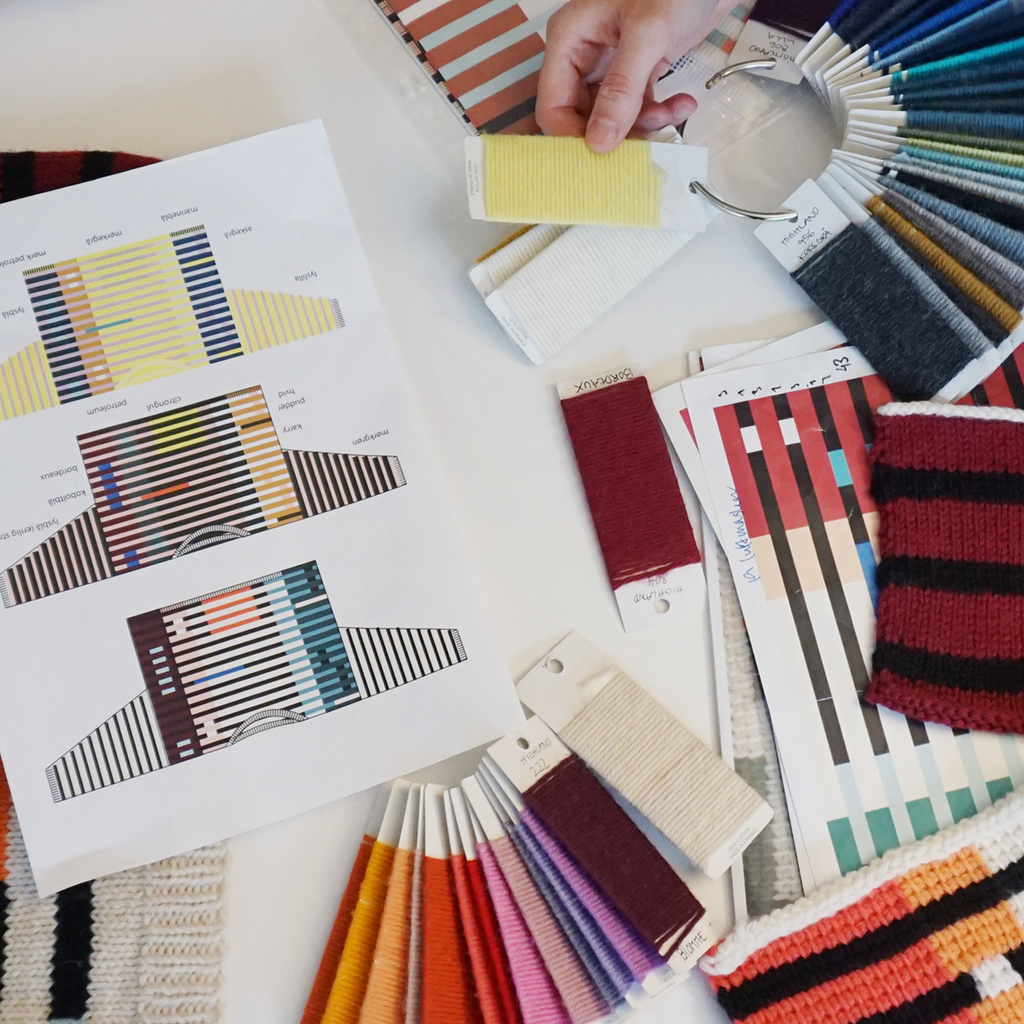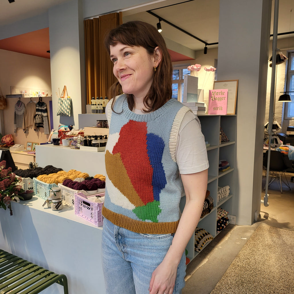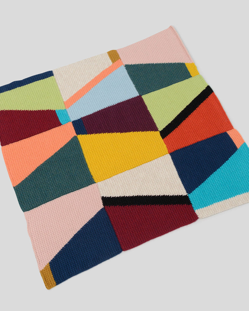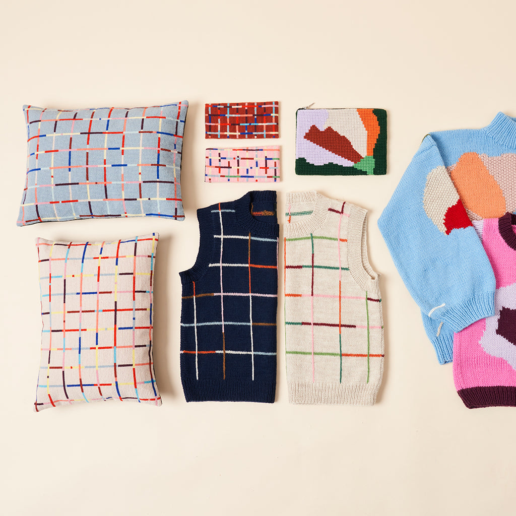HVASS&HANNIBAL arbejder i kollektionen for Kit Couture på tværs af strik, broderi og tunesisk hækling og tilfører håndarbejdet nye dimensioner med deres farverige, stramme kompositoriske design.