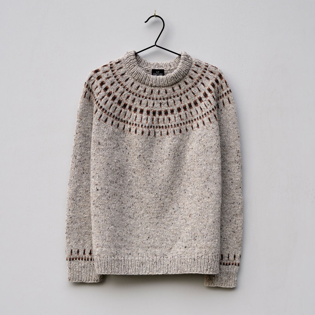 Størstedelen af sweateren strikkes i Tweed garnet med få detaljer i Highland garnet i bærestykket og inden ribkanten på ærmerne.