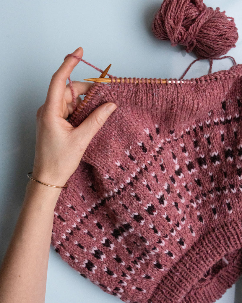 Kyholm Sweater strikkes oppefra og ned med et rundt bærestykke i flerfarvestrik. Vi har videoguides til alle teknikker.