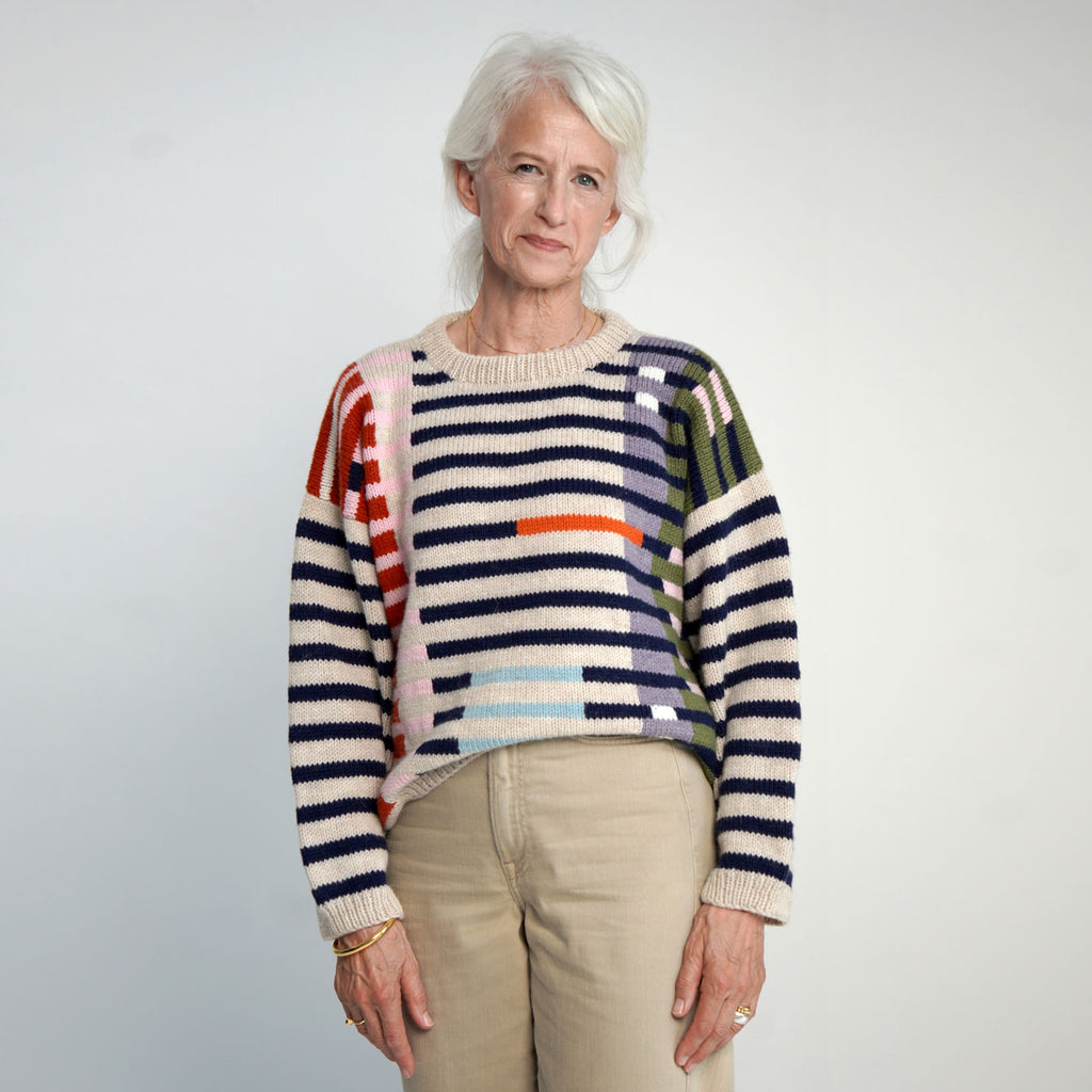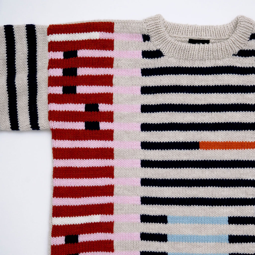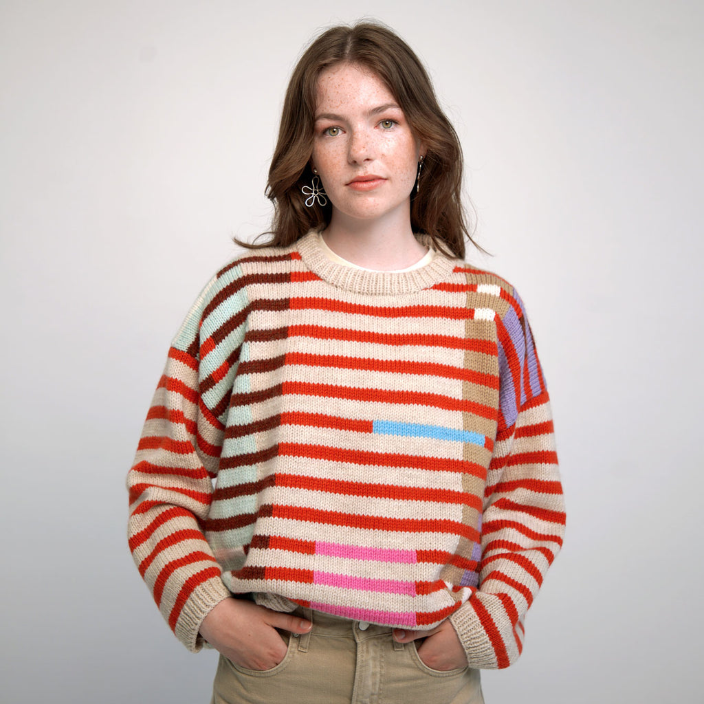 Langeland Sweater er inspireret af klassiske, stribede franske sweatre. Sweateren har en oversize pasform med påsatte ærmer og et grafisk mønster, som udfoldes i gobelinstrik. De to nye farvekombinationer i orangerød og marineblå viser de forskellige udtryk, som sweateren kan have.