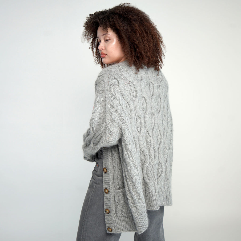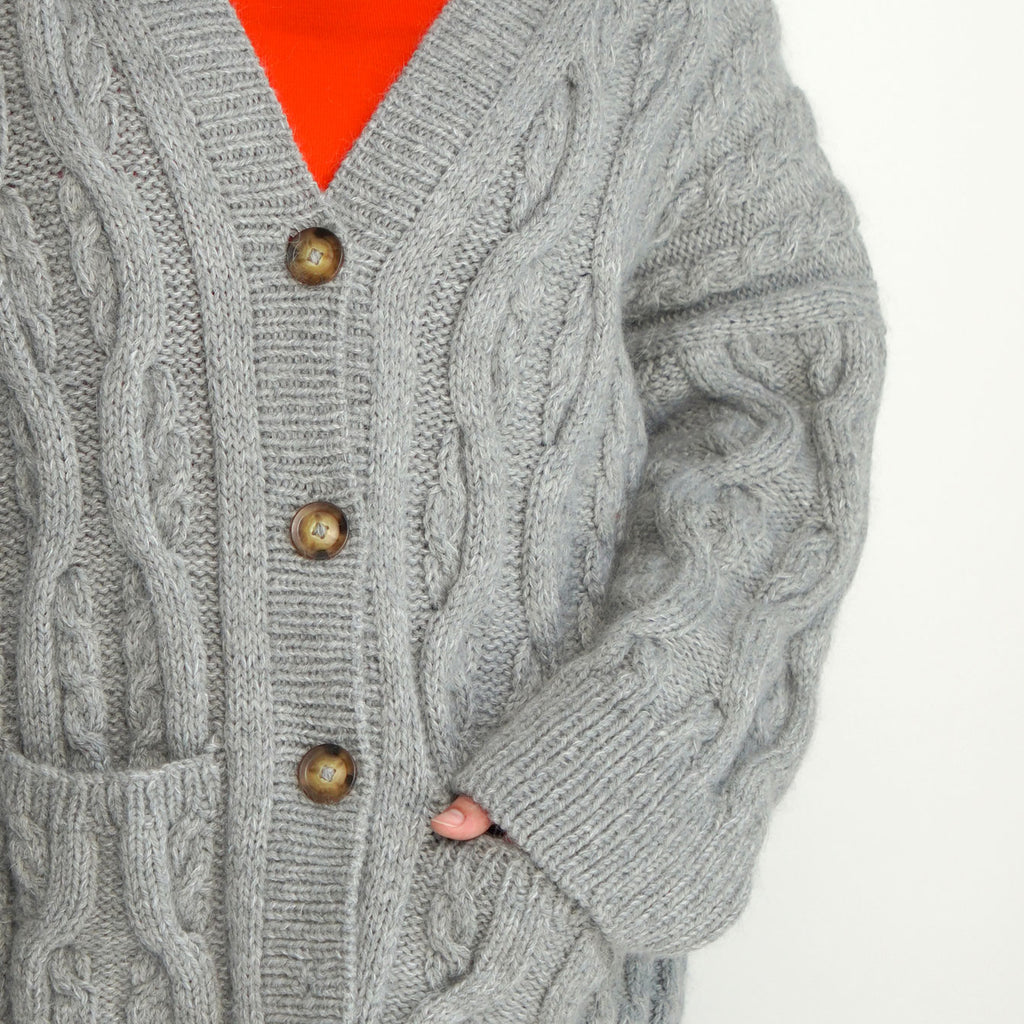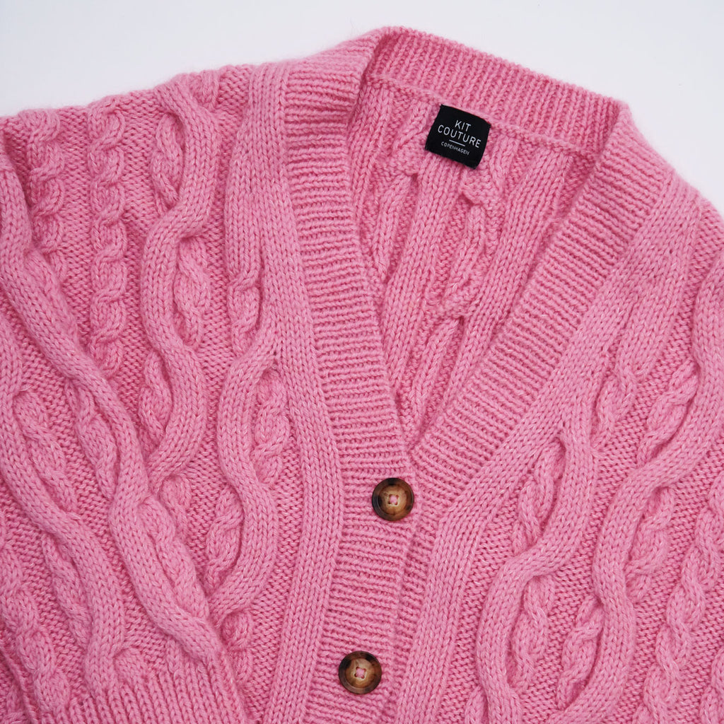 Skarø Cardigan strikkes i et tykt uldgarn med en følgetråd i mohair, så den får en dejlig stor oversize pasform. Udover det klassiske snoningsmønster, har cardiganen fine detaljer i form af European shoulder, italienske aflukninger og lommer.