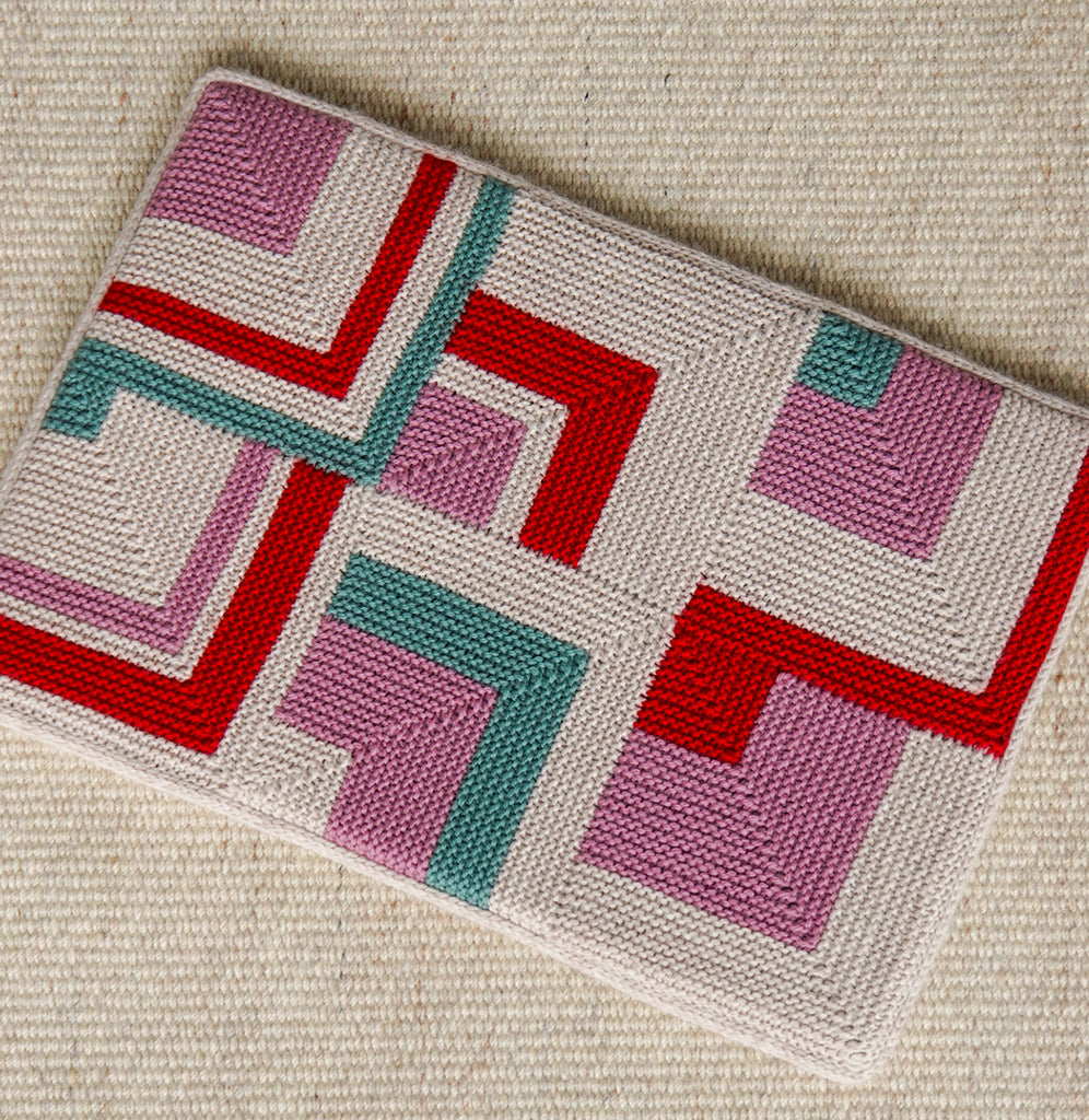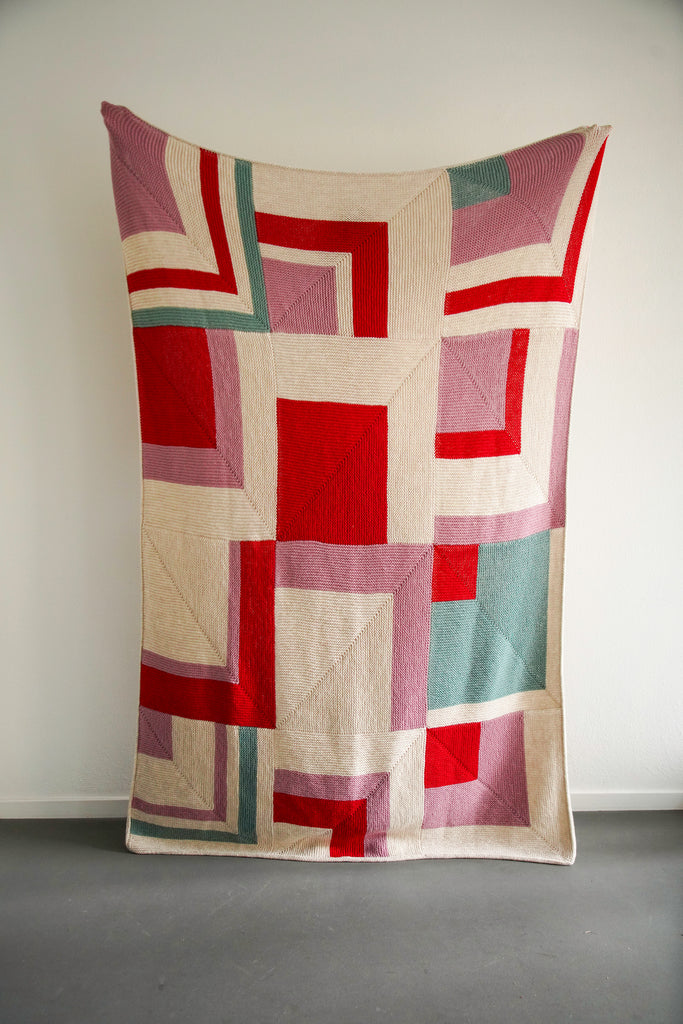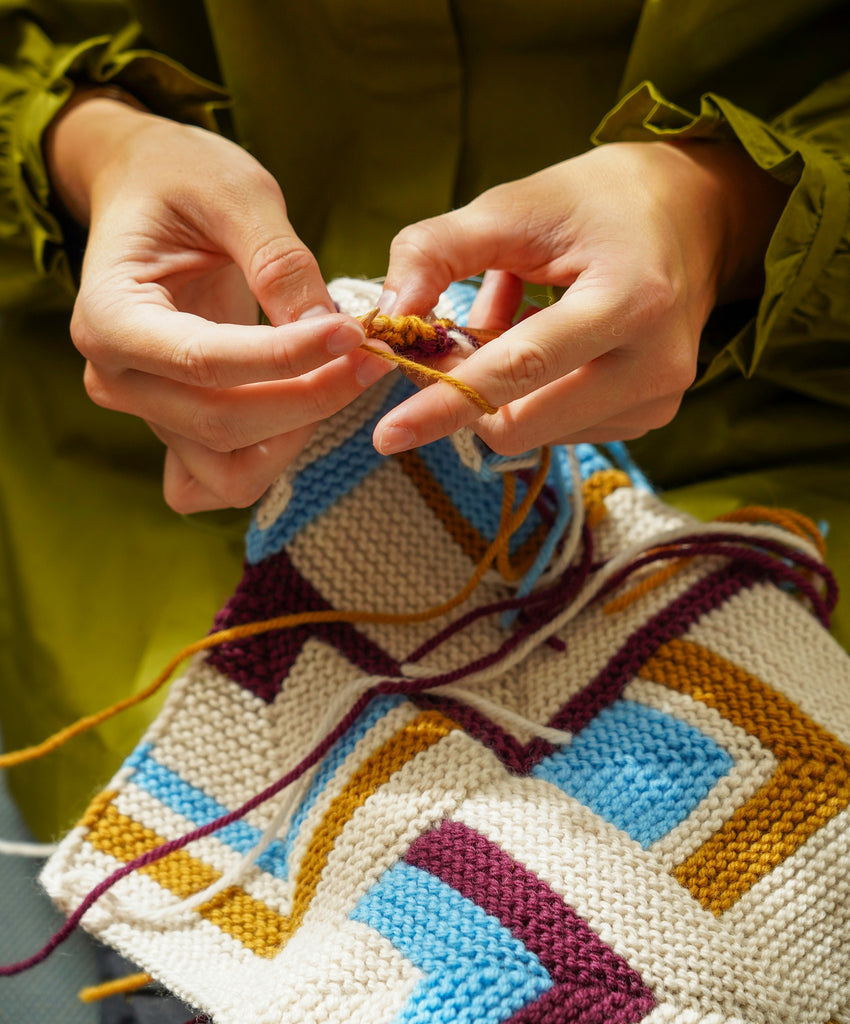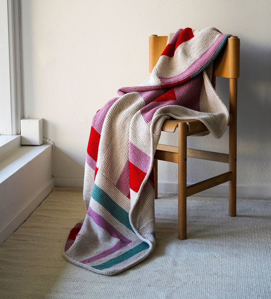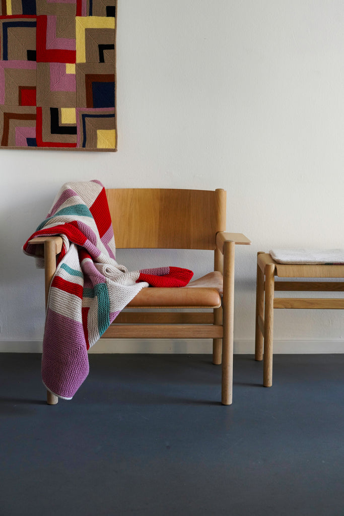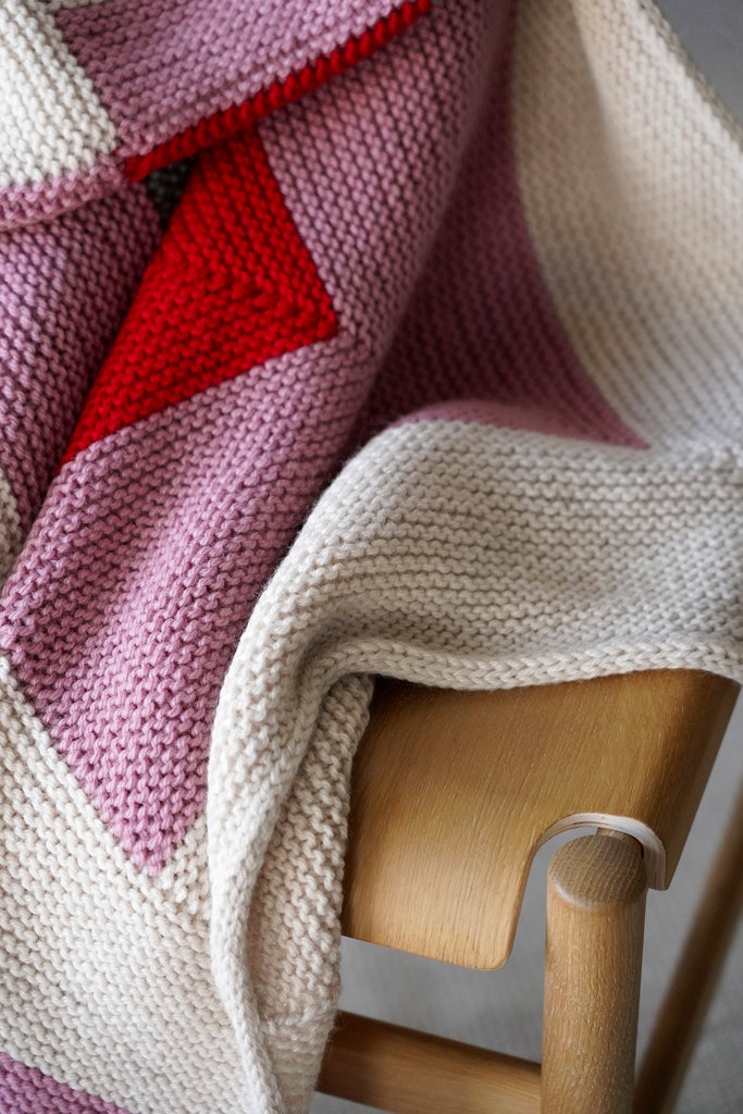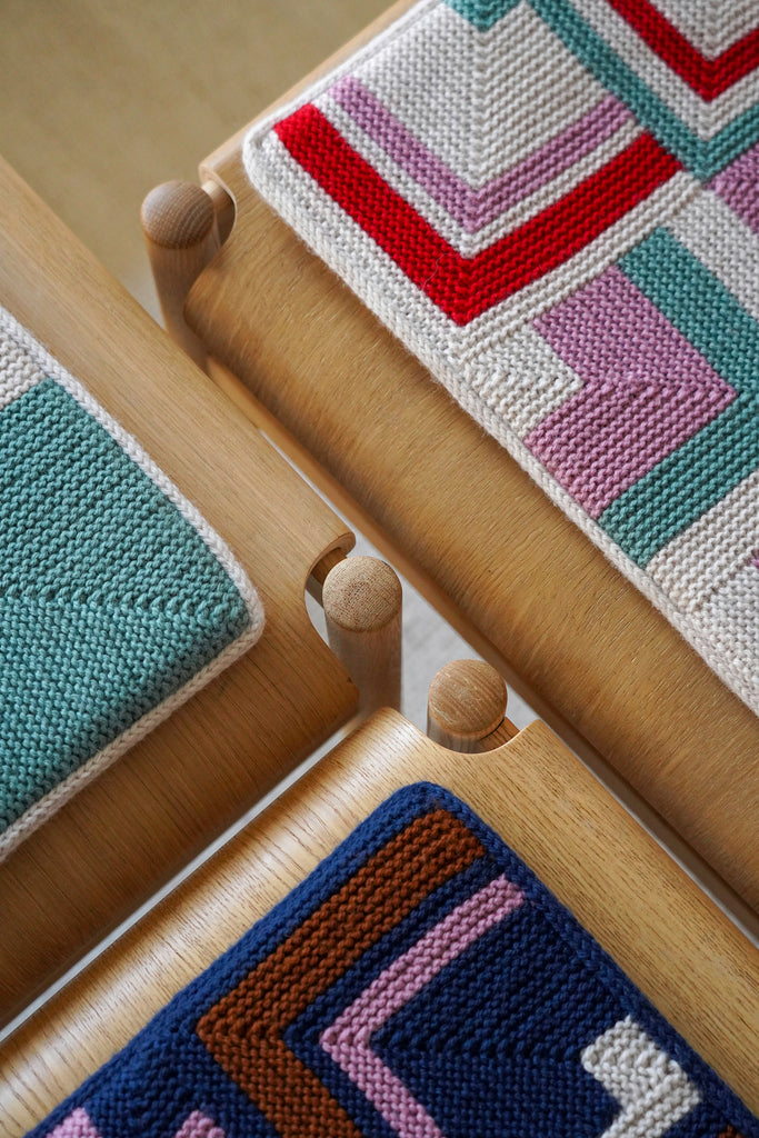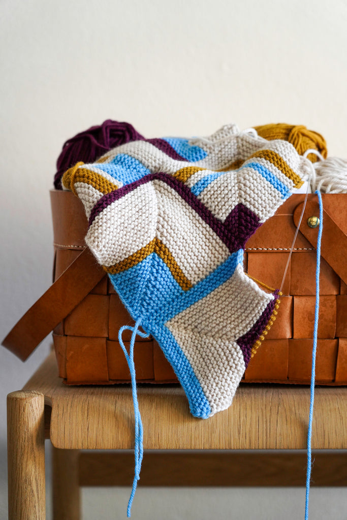 Du kan eksperimentere med farver for at danne spændende geometriske former eller strikke ensfarvede felter for at skabe diagonale linjer. Felterne strikkes i retriller, så alle kan være med!