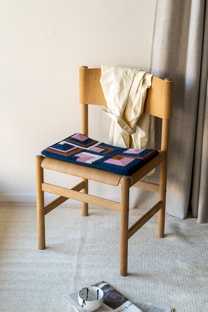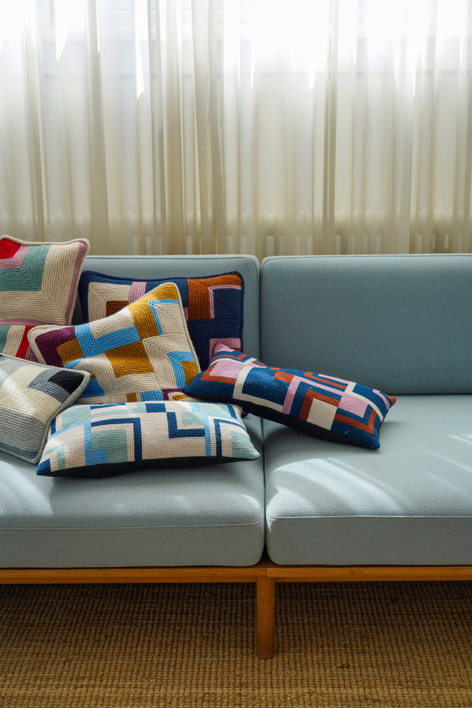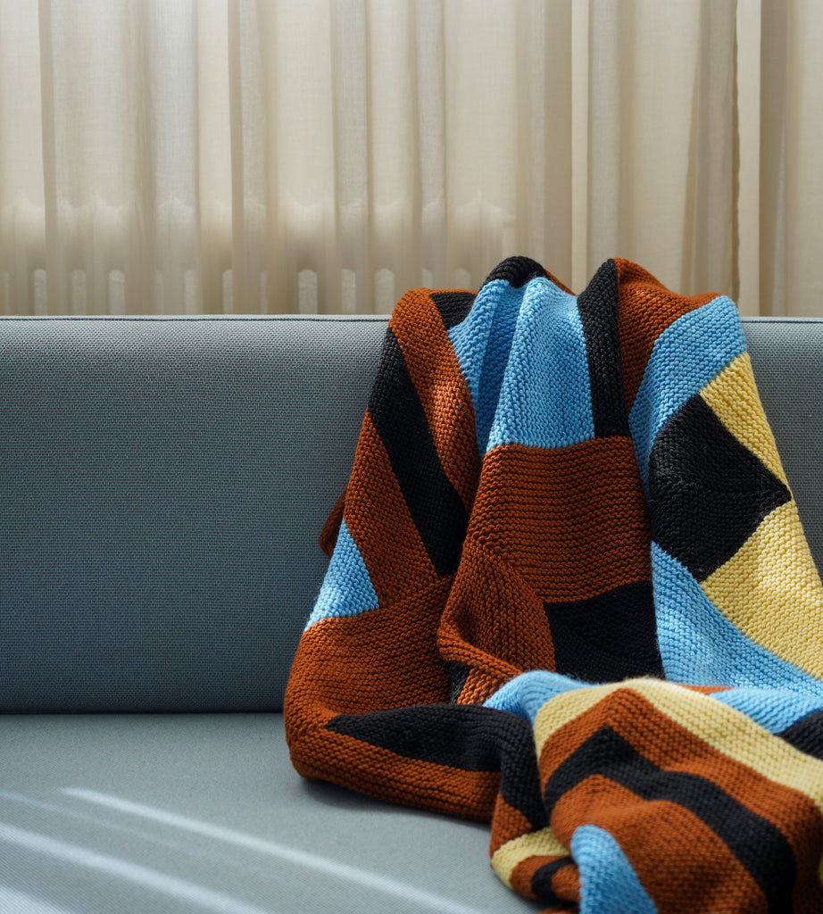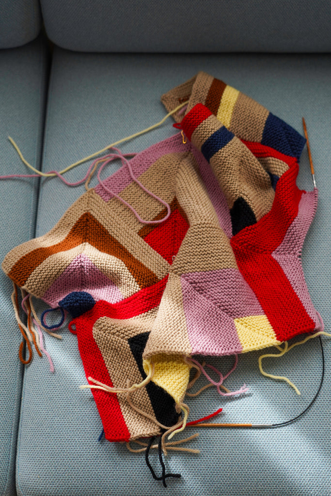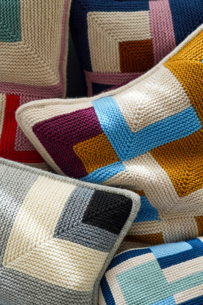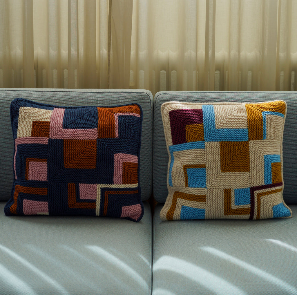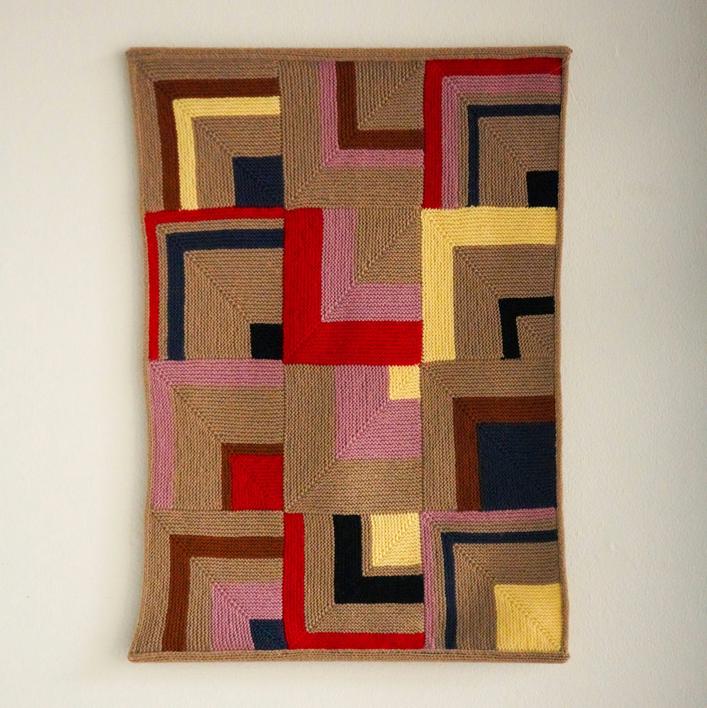 Du kan eksperimentere med farver for at danne spændende geometriske former eller strikke ensfarvede felter for at skabe diagonale linjer. Felterne strikkes i retriller, så alle kan være med!