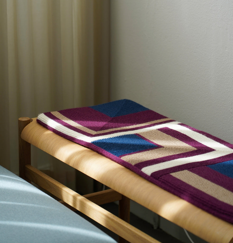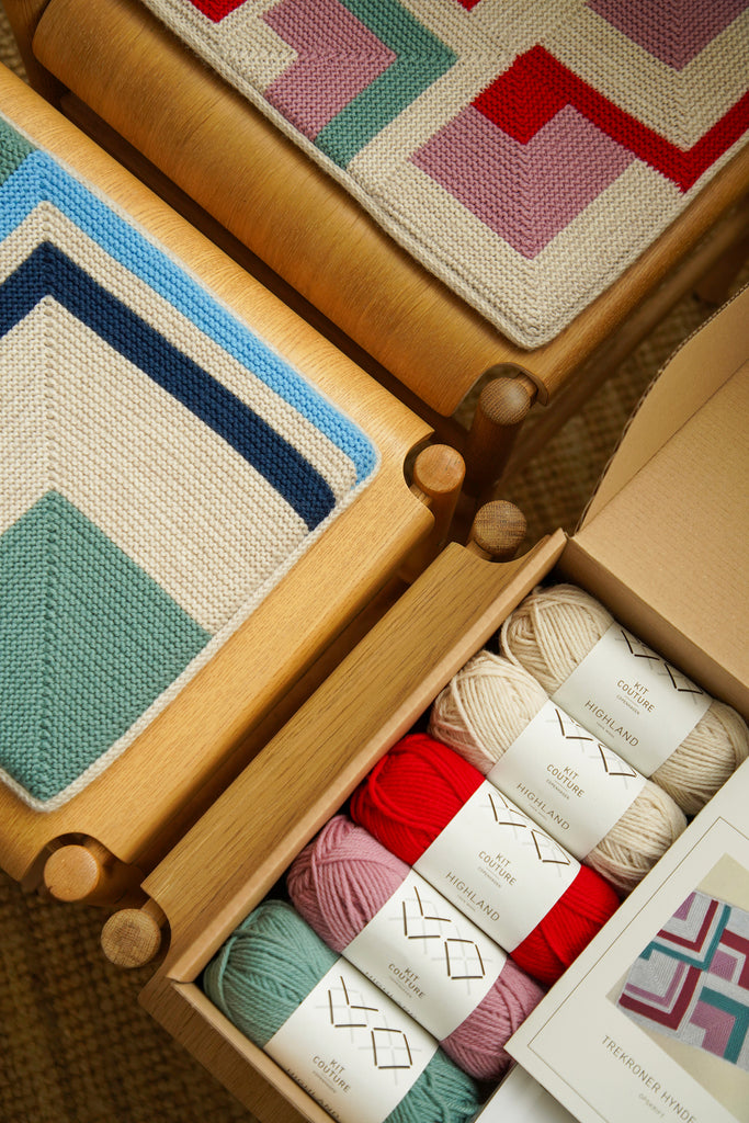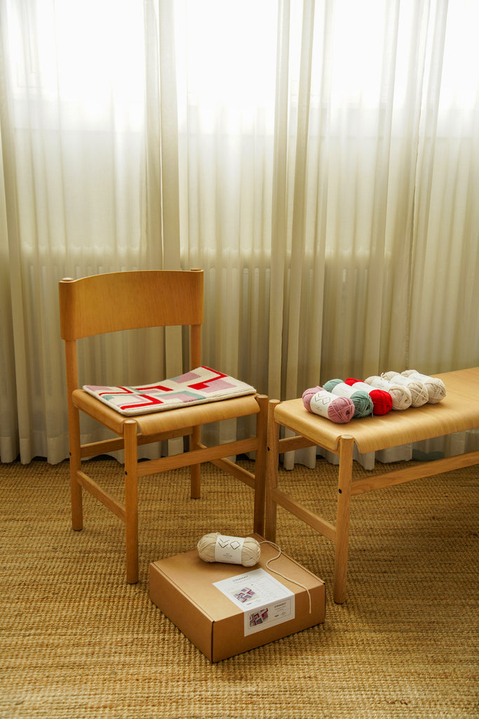 Træet er bøjet og får et organisk udtryk trods det faste materiale. Det bløde uldgarn strikkes i et kontrastfyldt, geometrisk mønster. Naturens materialer og kontrastforhold forenes i SOFT KIT på fineste vis.