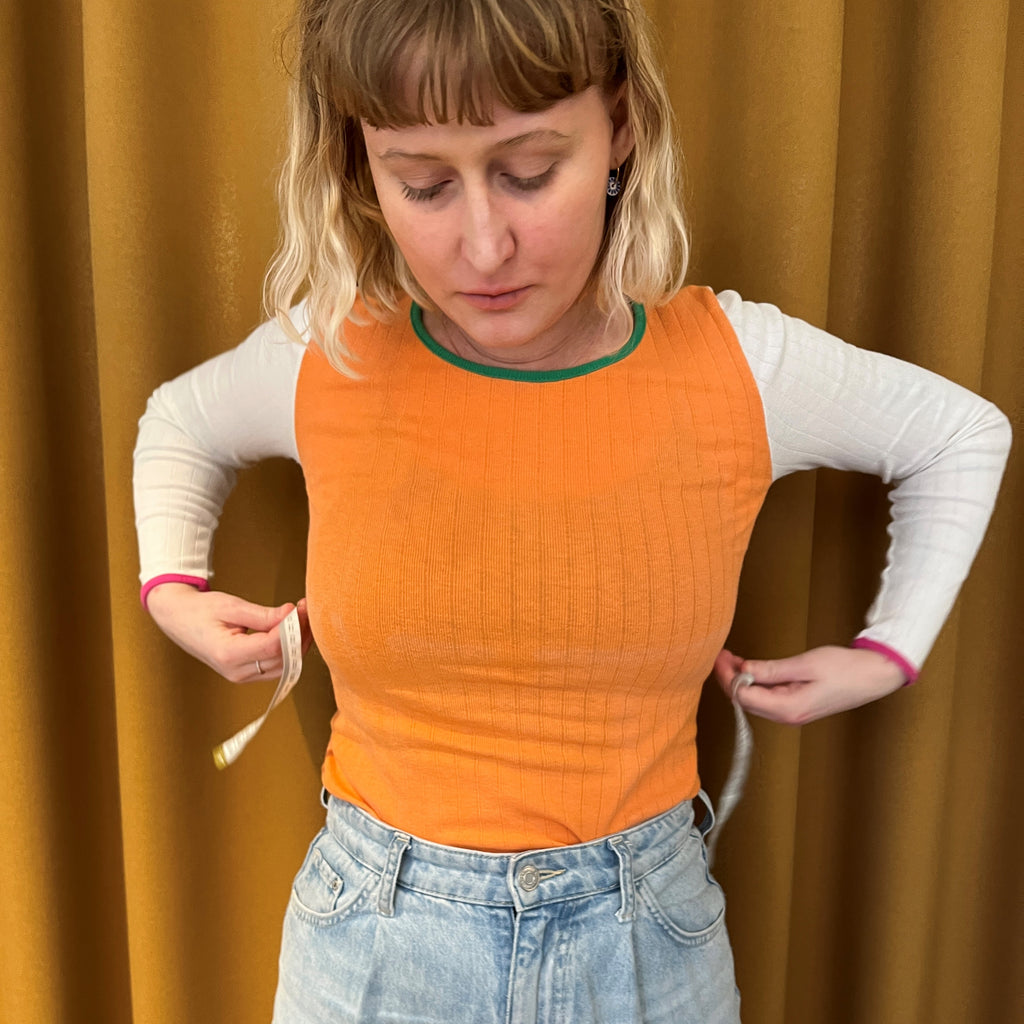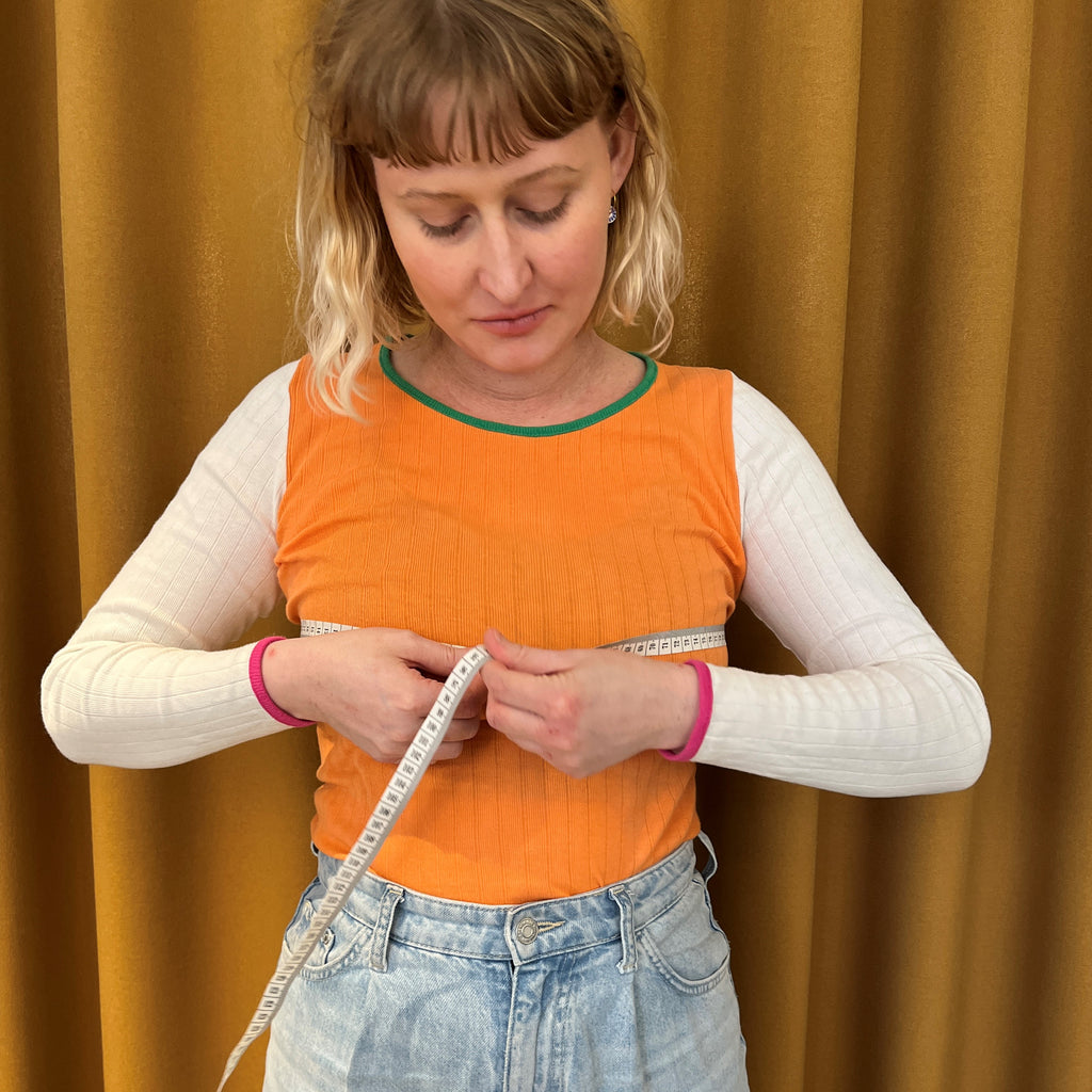 Det vigtigste mål at kende, når du skal strikke en sweater eller anden overdel, er dit brystmål. Det er det sted på kroppen, hvor du er bredest - enten om brystet eller ved maven. Her skal du måle tæt til kroppen uden at stramme til. For at få det mest præcise mål, kan du måle dig iført undertøj eller en tætsiddende bluse. Når du kender dit brystmål, kan du sammenligne det med overvidden i vores opskrifter.