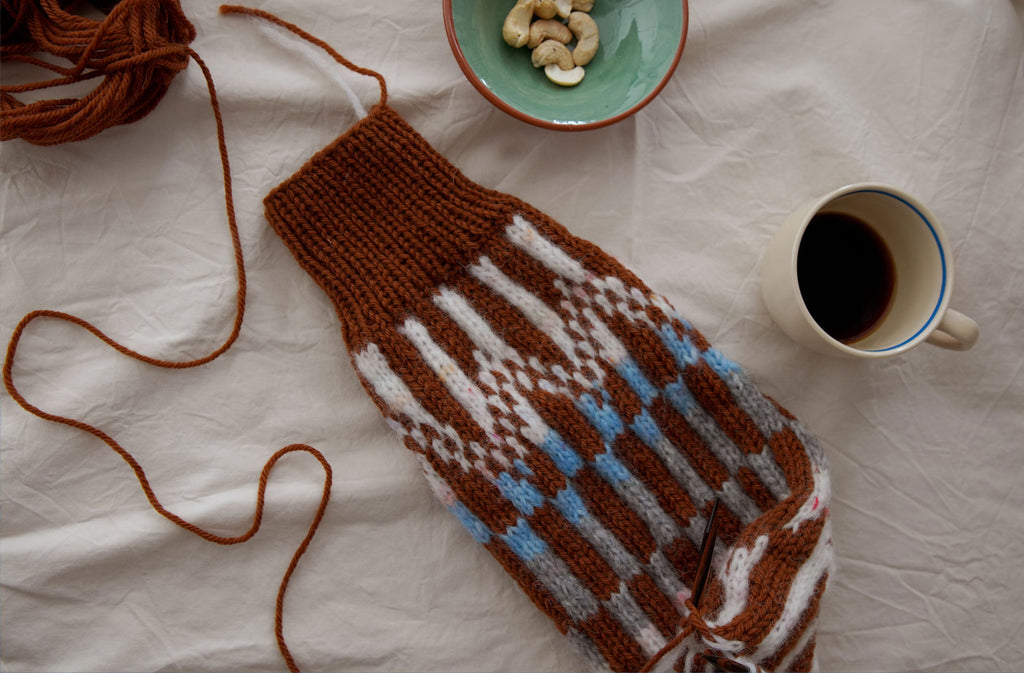 Læg de to dele med kanterne mod hinanden. Start med at stikke nålen ind i det første omvendte V på det stykke, du har liggende på din højre side. Derefter fører du nålen ind i det første omvendte V på det venstre stykke. Fortsæt med at stikke nålen igennem det næste omvendte V på højre stykke og derefter igen på venstre stykke, indtil du har syet alle maskerne sammen.