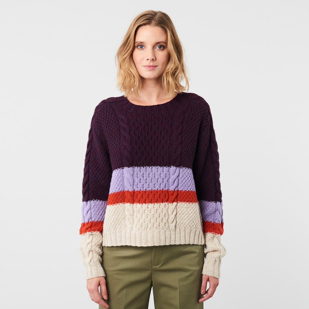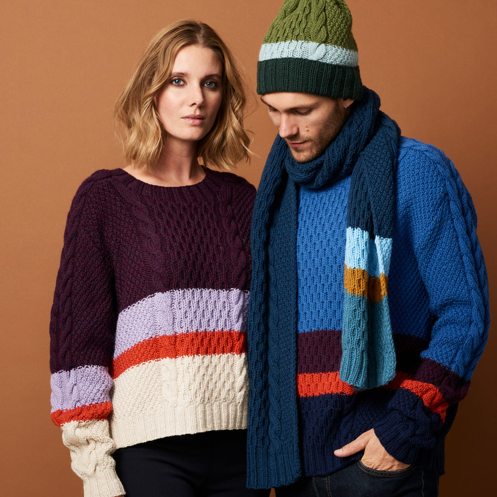 Ærø stylen er inspireret af de klassiske sweatre fra Irland, som enhver irsk fisker har. De irlandske sweatre strikkes i lokale egns-mønstre og oftest i råhvid uld. Vores fortolkning er inspireret af farverne fra Ærø, hvor der også fortsat er fiskeri. Ærø fås som sweater, huer, halstørklæder til både dame og mand. Der er også vanter og en smart taske til dame i dette mønster. Ærø-serien er designet af KIt Coutures faste designteam.
