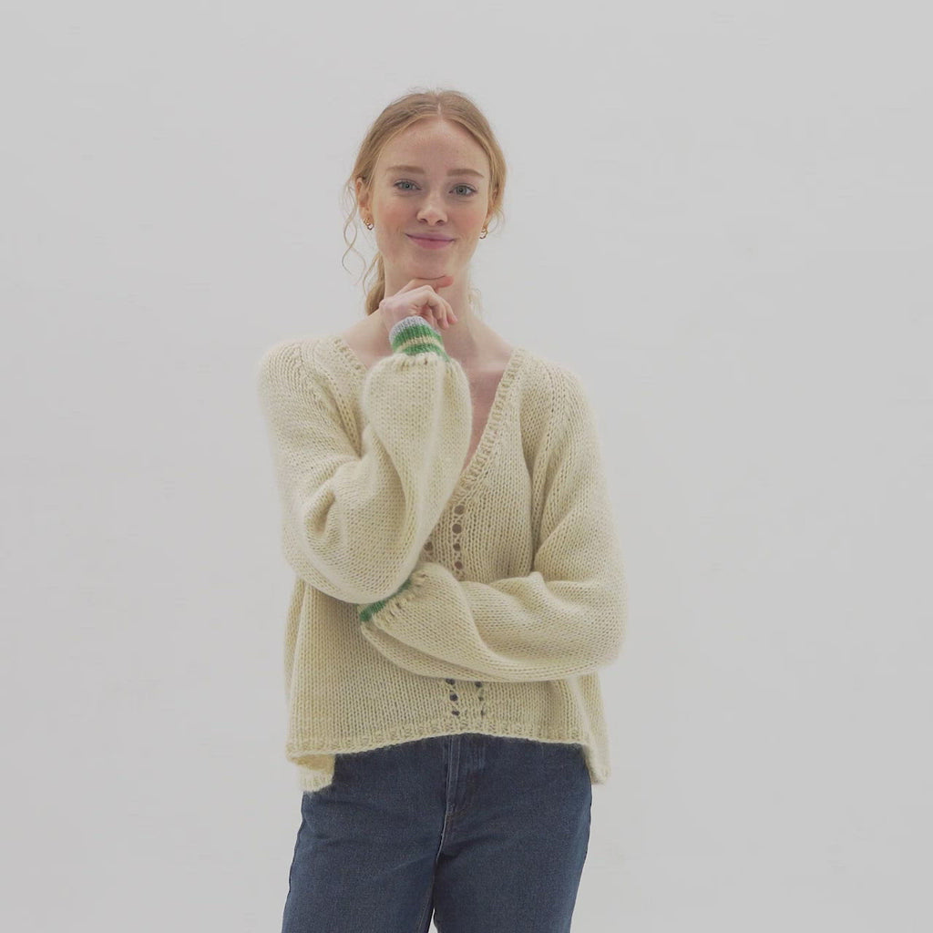 Almö Bluse strikkes rundt nedefra og op med to tråde Merino og to tråde Kid Mohair. Ærmekanterne har en stribe af glimmergarn og to striber af en kontrastfarve i Merino. Et lille hulmønster pynter for og bag.