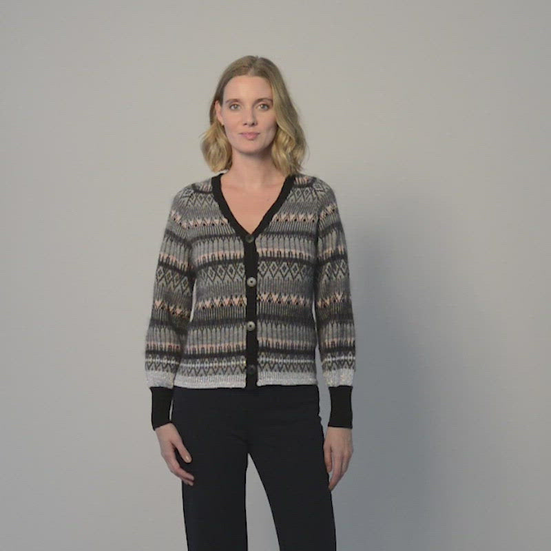 Baggen Cardigan strikkes i flerfarvestrik nedefra og op. Der strikkes efter diagram hele vejen igennem. Først strikkes ærmer og krop hver for sig, herefter samles delene til et bærestykke med raglanindtagninger, hvor der samtidig tages ind til v-hals. Til slut sys der på hver side af klippemasker, hvorefter der klippes op og strikkes forkanter