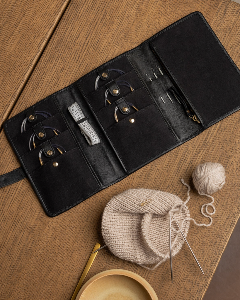 Lækkert etui med plads til rundpinde, nåle og andet tilbehør. Kvaliteten er blødt læder, som sikrer en lang holdbarhed. Fås i farverne valnød og sort. Produceret af det danske firma Re:Designed.