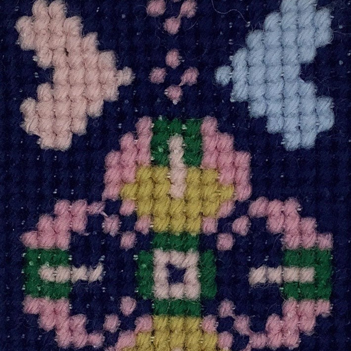 Fejan Pung er ideel til alle dine kort, smykker eller andre småting. Denne raffinerede pung broderes med korssting i uldgarn i et feminint, retrolignende mønster med både blomster og hjerter.