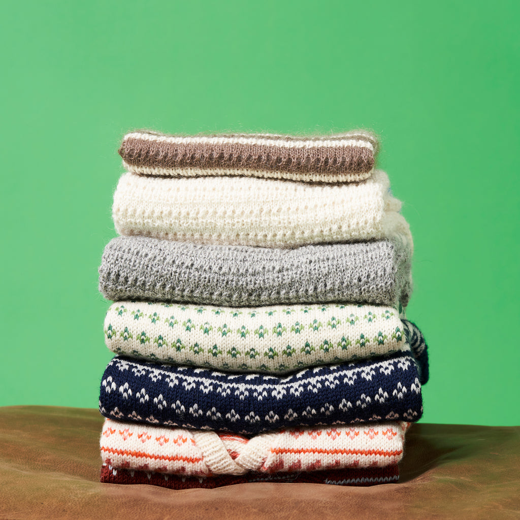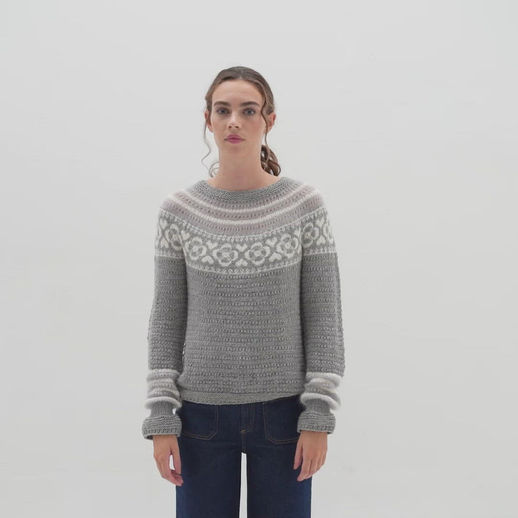 Fejan Bluse strikkes oppefra og ned i struktur- og flerfarveteknik. Halskanten strikkes i Highland, hvorefter Kid Mohair og Alpaca danner det fine bærestykke.