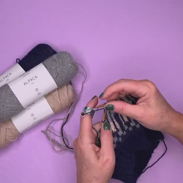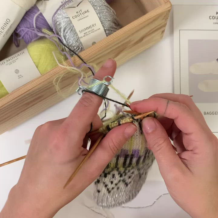 Denne ring kan sættes på pegefingeren og hjælper dig med at holde styr på dit garn, når du strikker med to farver.