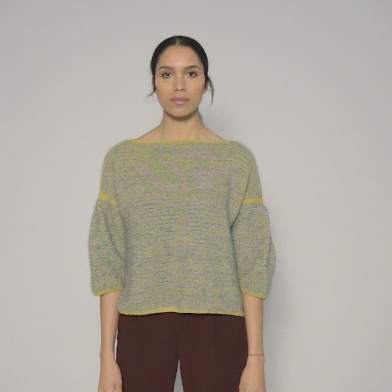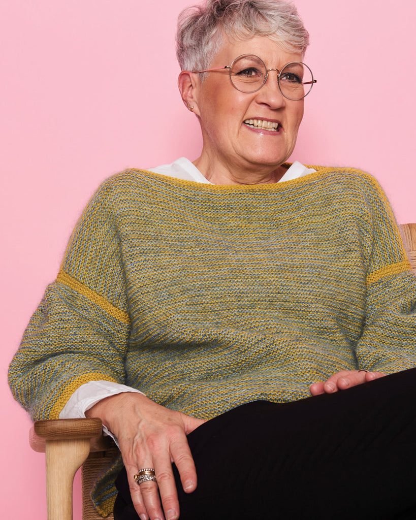 Grunnet er en smart bluse, der strikkes i retriller med et mix af det luksuriøse Kid Mohair garn og lune Highland Mini garn. Blusen har fine wienerlæg på ærmerne og slidser i siderne, som giver blusen et feminint og moderne look.