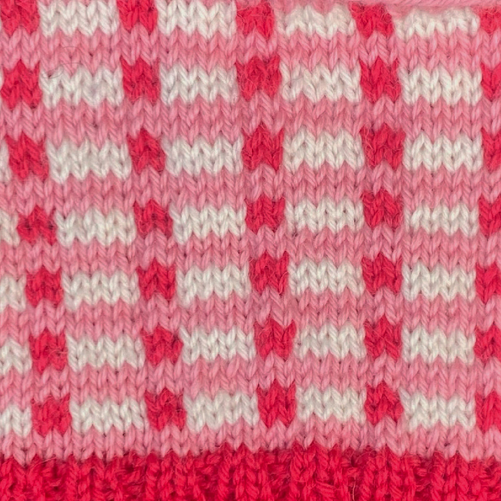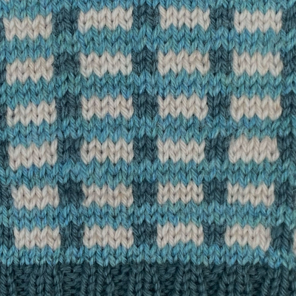 Hinnøya Strømper strikkes oppefra og ned og med timeglashæl. Mønsteret strikkes i tre farver, mens rib, hæl og tå strikkes ensfarvet.