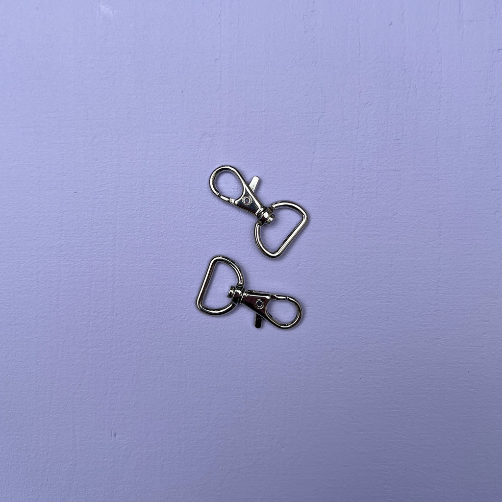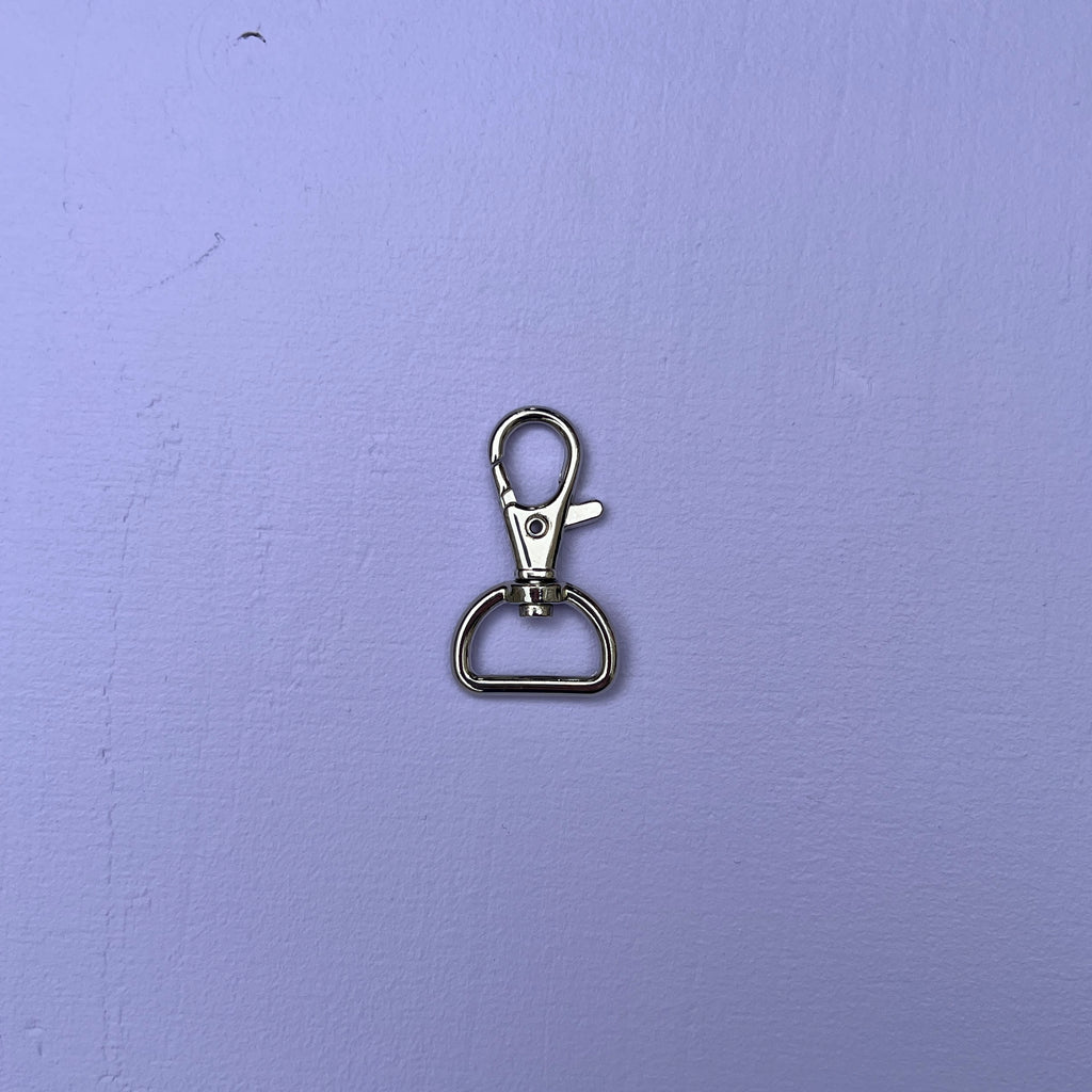 Karabinhage bruges til stropper på tasker, hvor den sættes i en D-ring (bestilles for sig). Karabinhagen er i sølv metal og sælges per styk.
