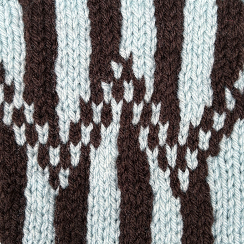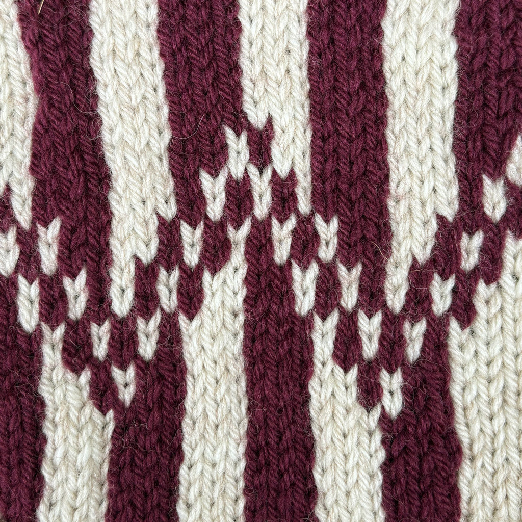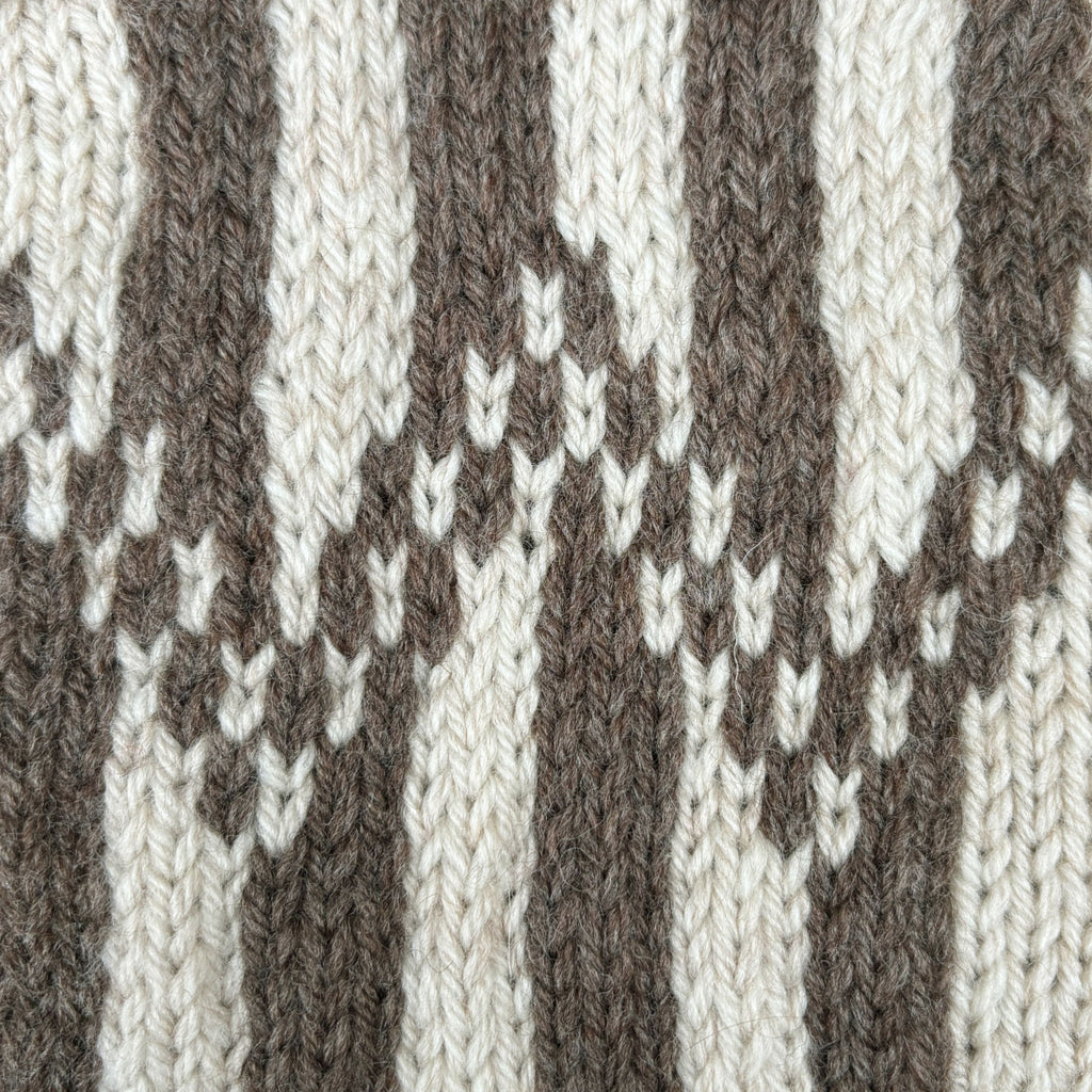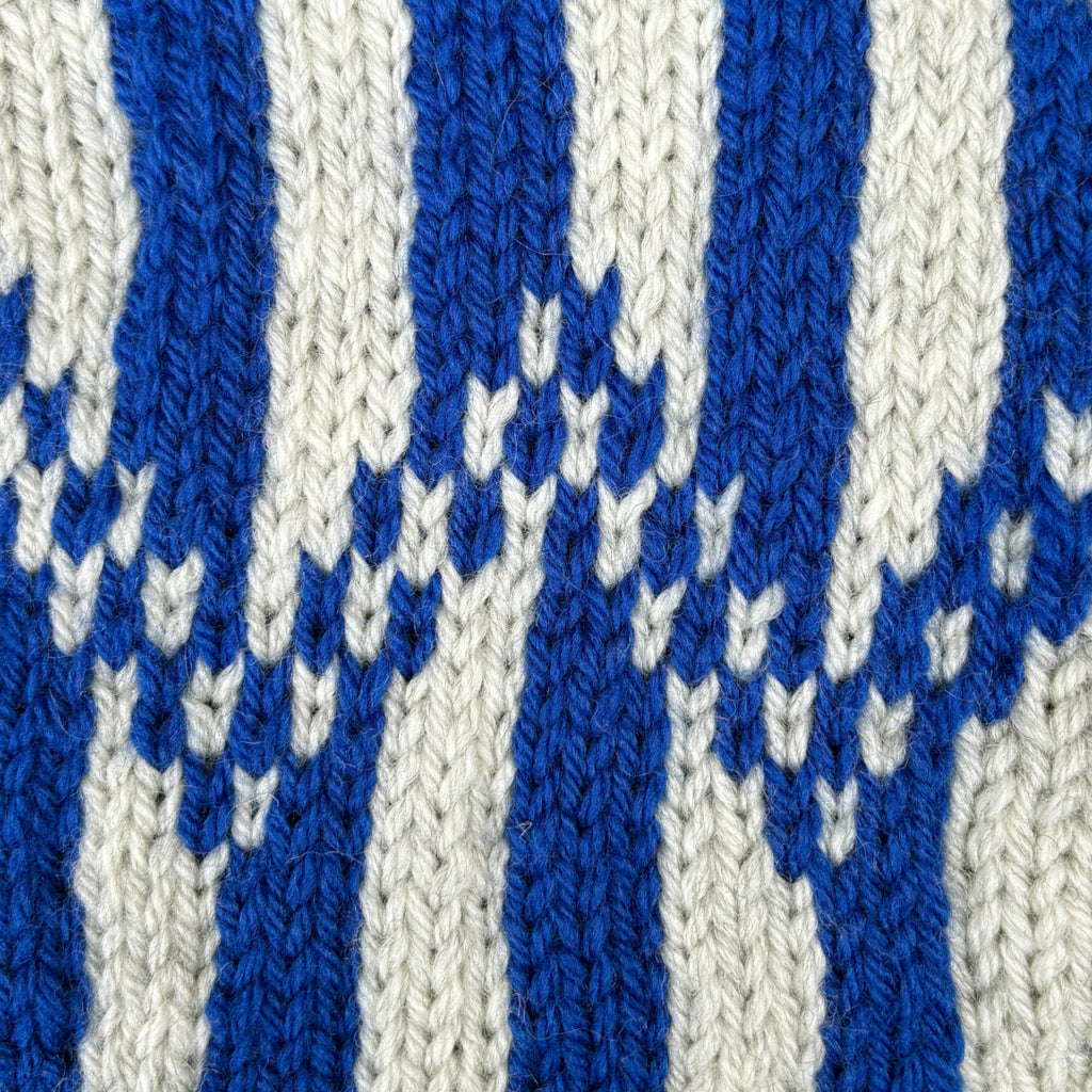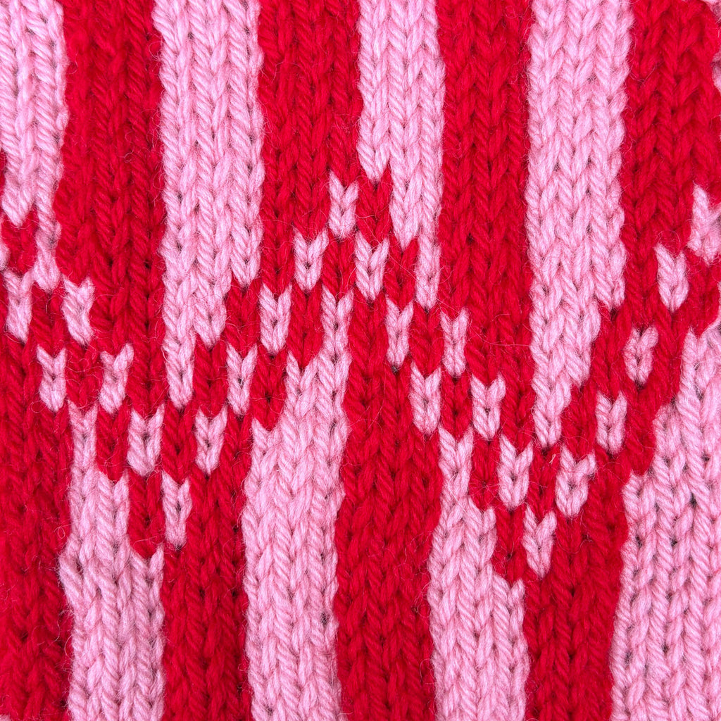 Disko Taske strikkes rundt i flerfarvemønster med to farver. Efterfølgende monteres tasken med fór og taskehank, som du selv kan knytte.