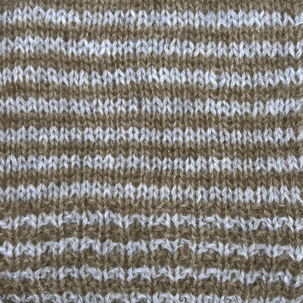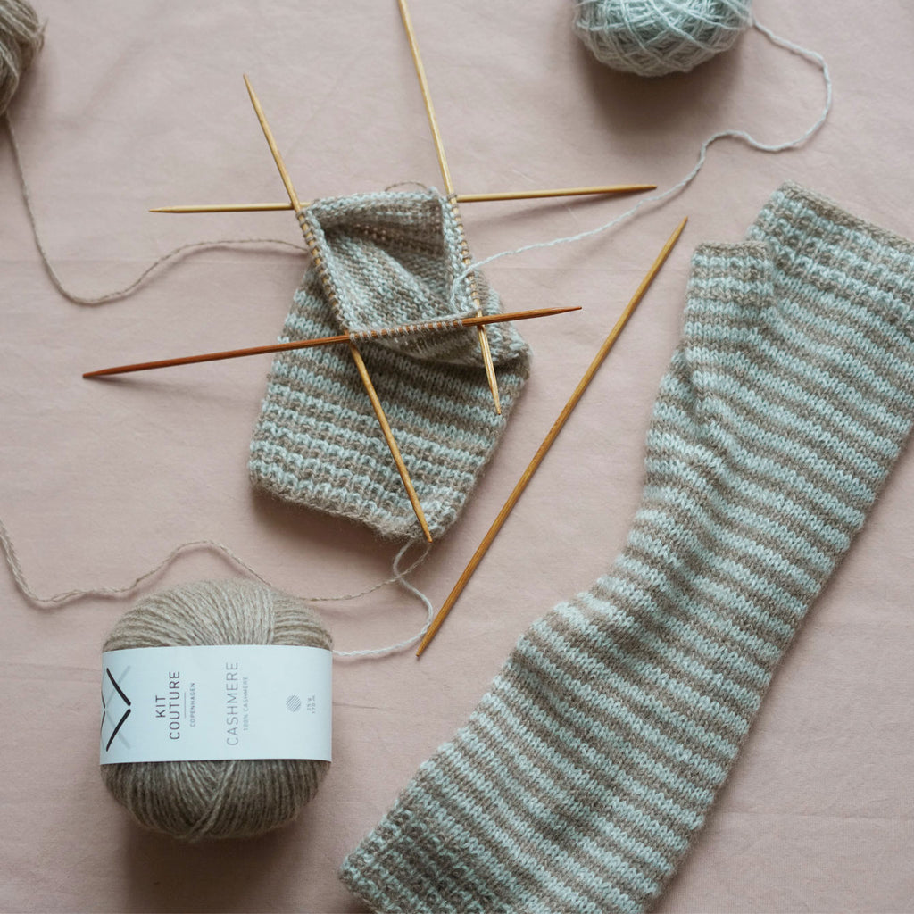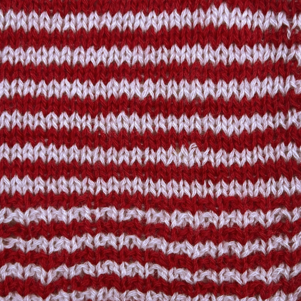 Esjan Halvvanter strikkes rundt i glatstrik med smalle striber og med udtagning til tommel. Kanterne strikkes i perlerib.