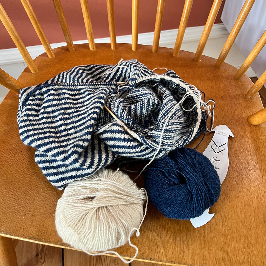 Esjan Slipover strikkes i glatstrik nedefra og op. Kanterne strikkes i perlerib, og det hele strikkes i smalle striber. Der strikkes rundt op til ærmegabet, hvor arbejdet deles, og for- og bagstykke strikkes hver for sig. Skuldrene strikkes sammen, og der strikkes masker op til kanterne.