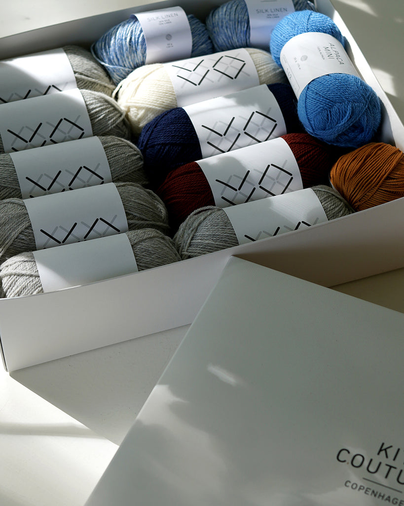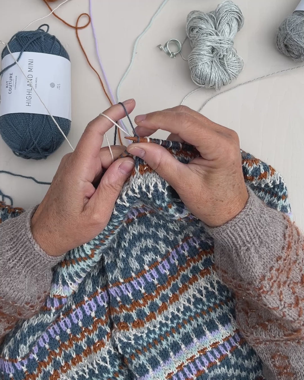 Fanø Sweateren har en rummelig pasform med høj hals, og strikkes rundt nedefra og op i flerfarvestrik med fire forskellige garnkvaliteter. Highland Mini som bundfarve og mønster i Silk Linen, Shiny Cotton og Alpaca Mini.