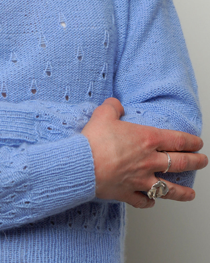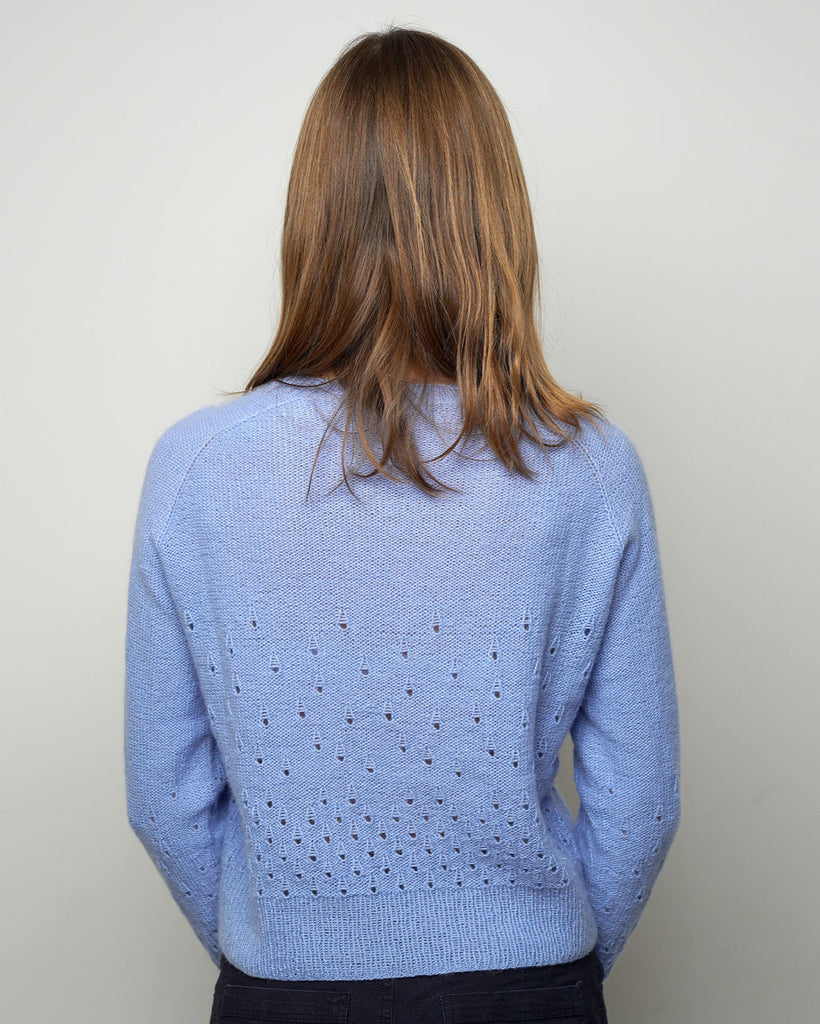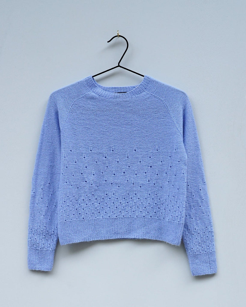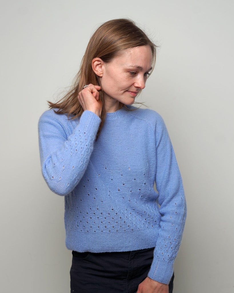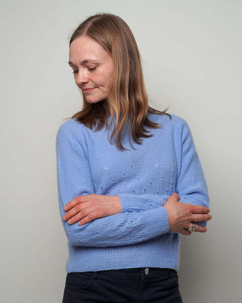 Fugloy Bluse er inspireret af Færøernes regndråbefyldte tågedis. Dråberne strikkes tæt nederst på modellen - og de bliver færre og færre, jo længere du strikker. Fugloy Bluse strikkes i vores 100% Cashmere garn, som er et uendelig blødt og let garn.