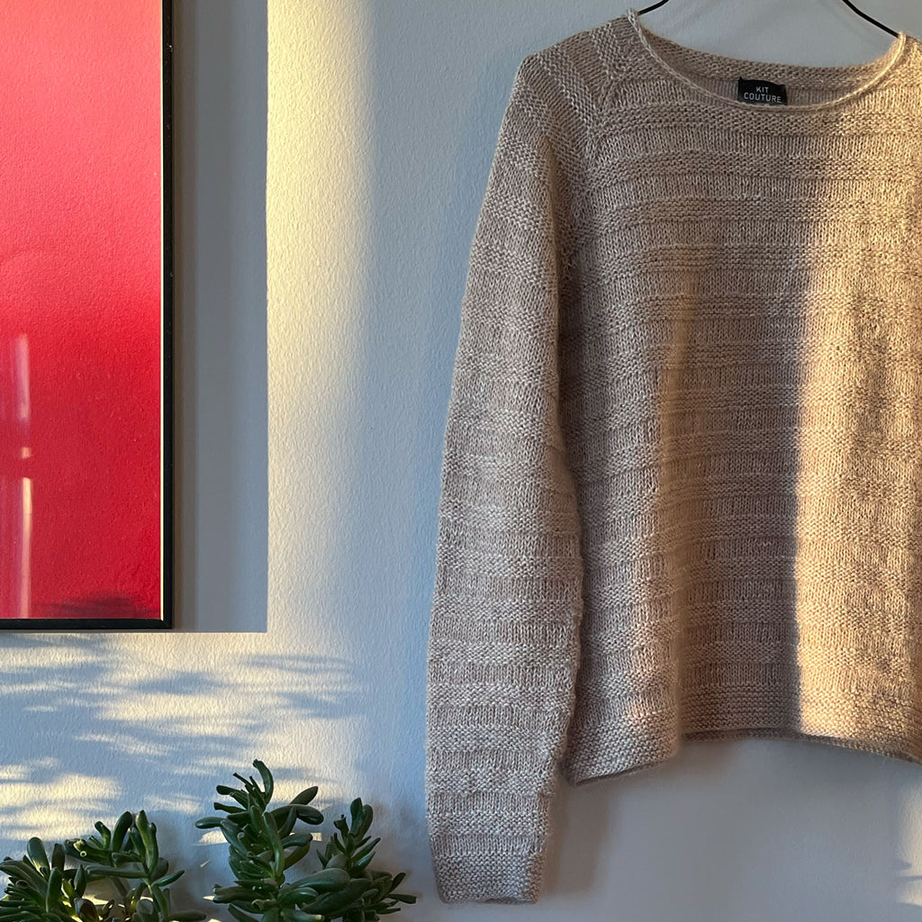 Striberne strikkes med skiftevis fem omgange ret og fem omgange vrang. Kanterne på krop og ærmer strikkes i retriller, mens halsen lukkes elegant af efter to omgange ret.
