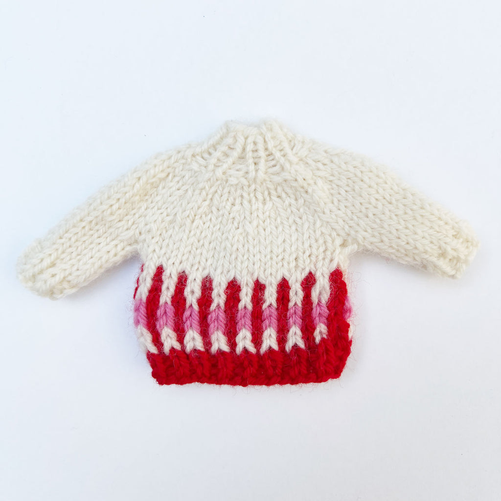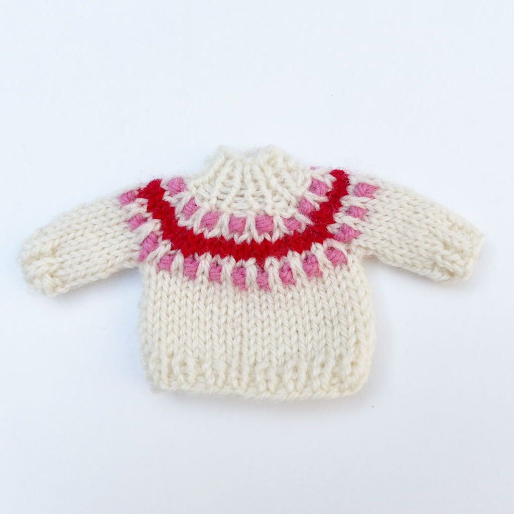Du får en grundopskrift til en ensfarvet mini sweater og tilhørende diagrammer og forklaringer til flerfarvestrik, vævestrik og broderi.