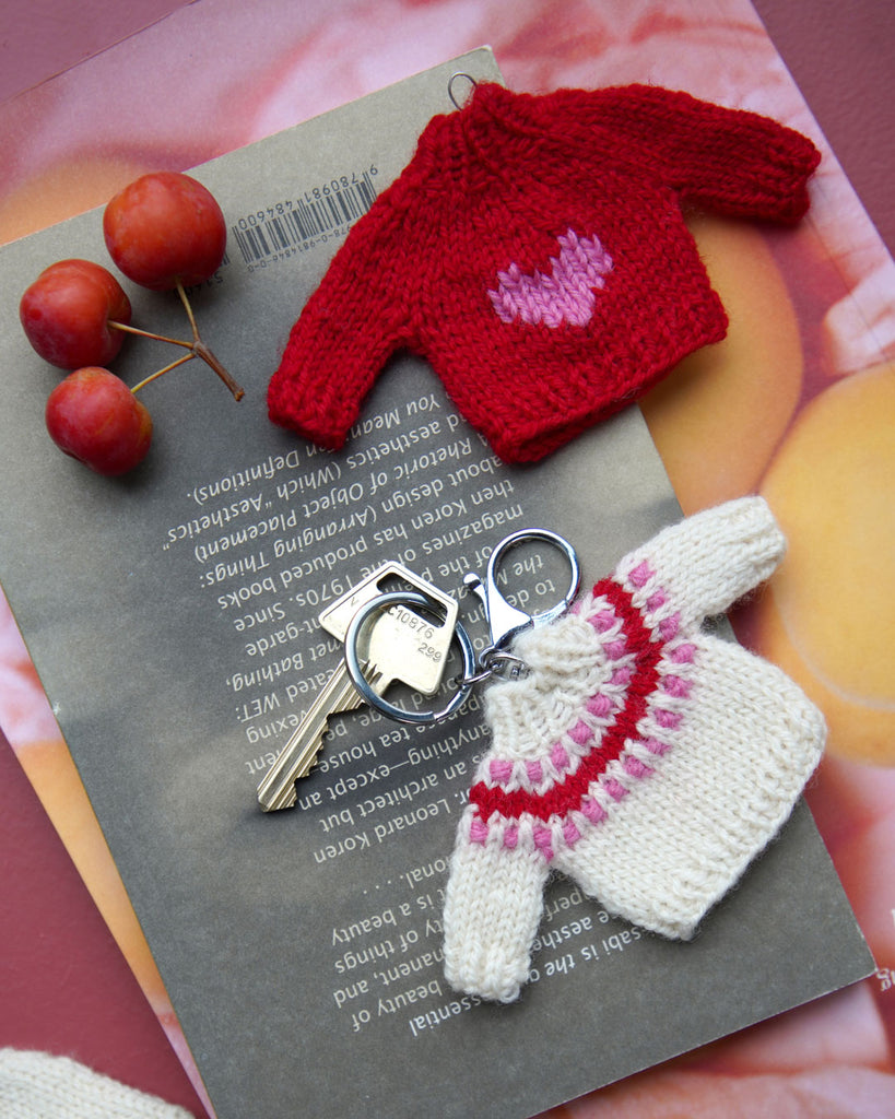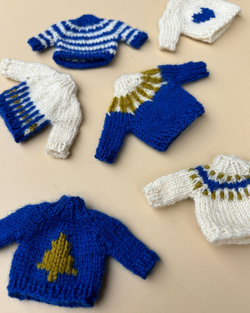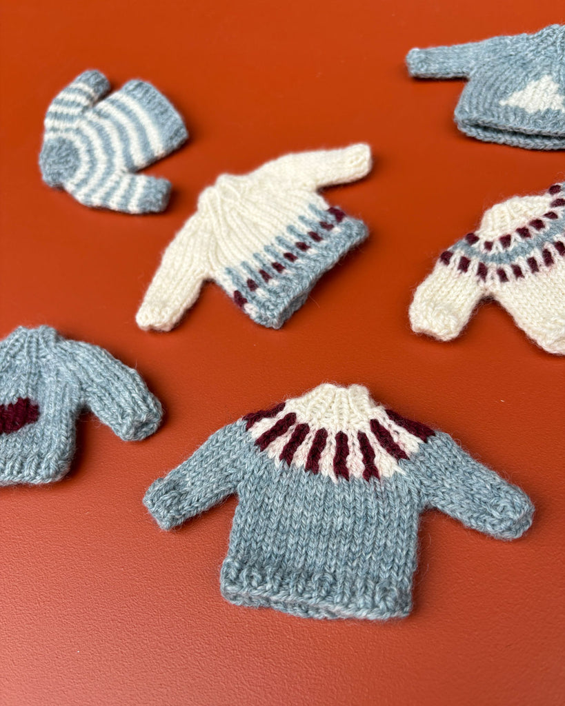 Kit Couture Mini Sweatre er designet med udgangspunkt i nogle af vores bestsellere: Disko, Anholt, Baggen, Sørøya og Aluk. Du kan vælge at brodere eksempelvis julemotiver eller bogstaver på de ensfarvede modeller. De små sweatre kan bruges som julepynt på en snor i vinduet - eller på små bøjler på juletræet. Du kan også vælge at sætte dem på dine gaver, på din taske – eller på en nøglering. Mini Sweatrene strikkes i vores bløde Highland Mini garn og motiverne broderes i vores Uldbroderigarn.
