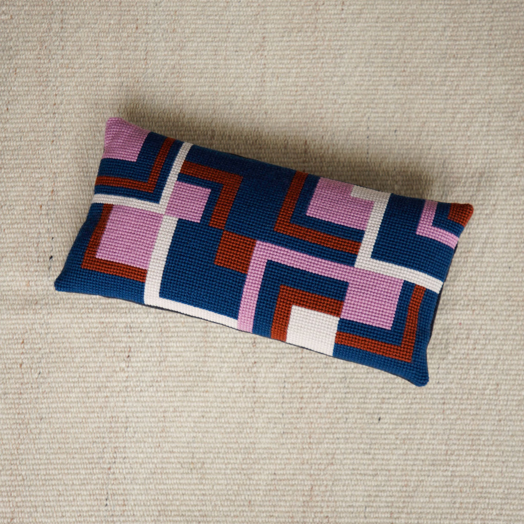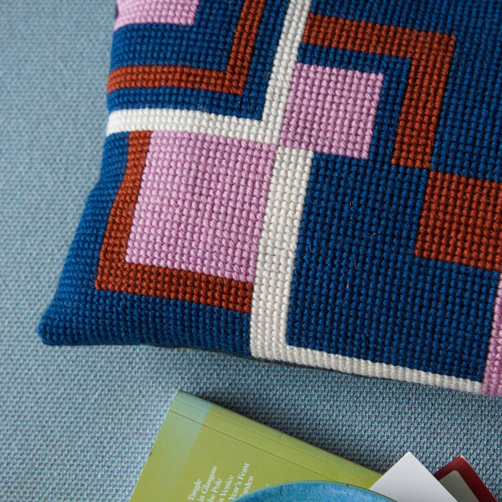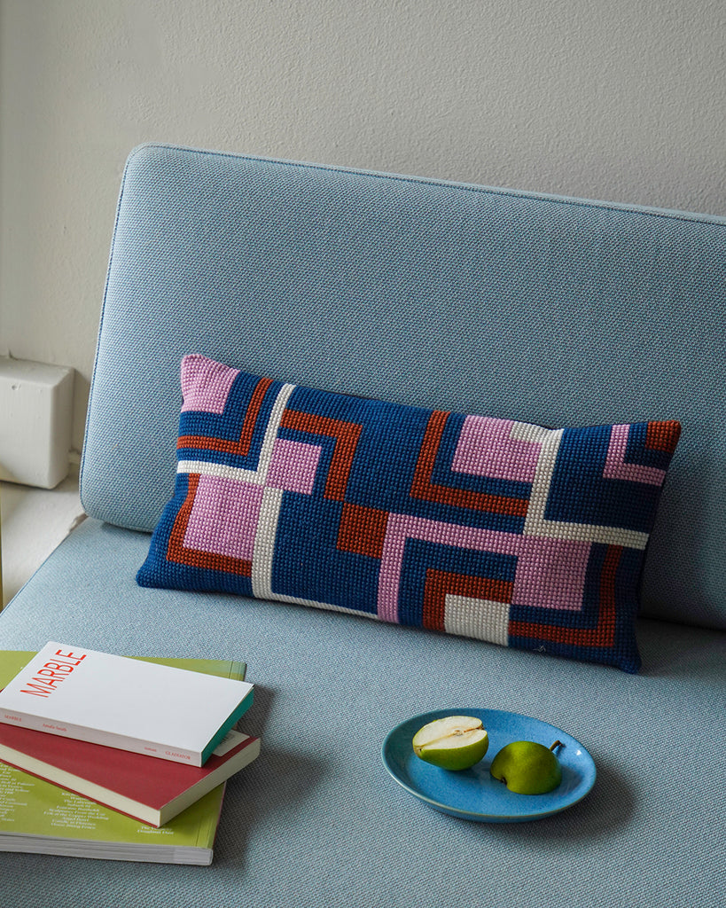 Trekroner Pude Mini har et modulært design med grafiske felter i fire matchende farver. Puden broderes i vores bløde uldbroderigarn (100% uld).