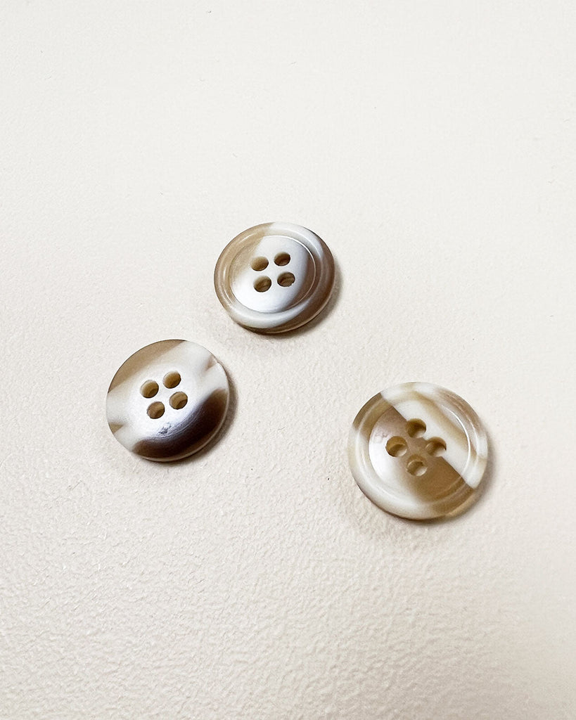 Casein knapper med fire huller. Denne knap er god at bruge til projekter strikket i tyndere garner. Vi bruger den til Esjan cardigan.