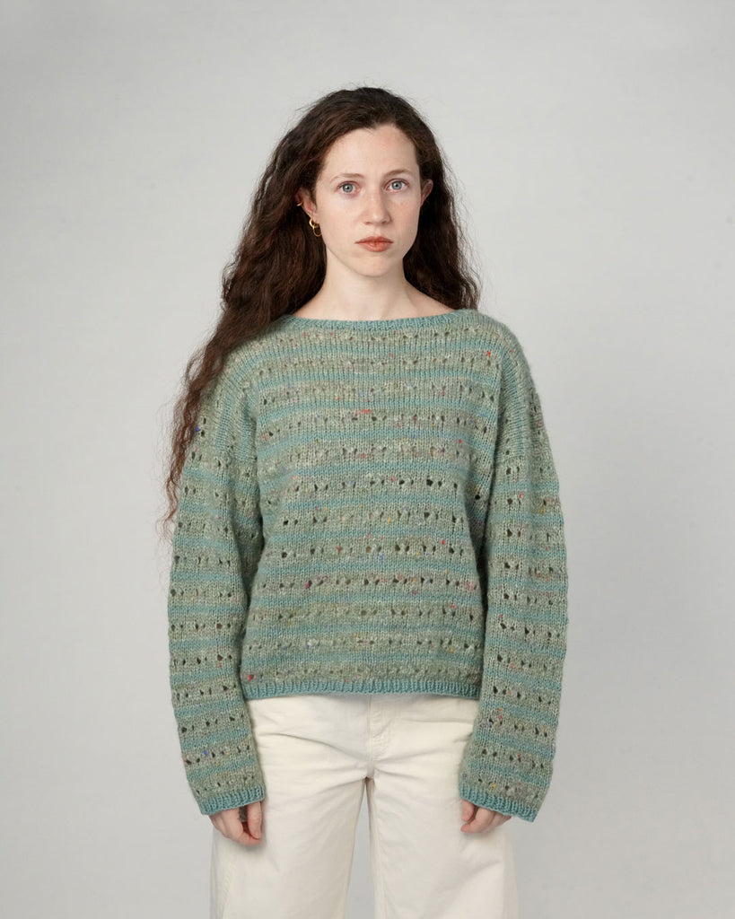 Kvaløya Bluse er ideel her til foråret, da den er luftig - og pasformen er rummelig og enkel. Denne style strikkes i striber skiftevis med Blow og Highland i matchende farver, og Highland anvendes til alle kanter. I striberne med Blow er der et fint hulmønster, som giver et feminint og let udtryk.