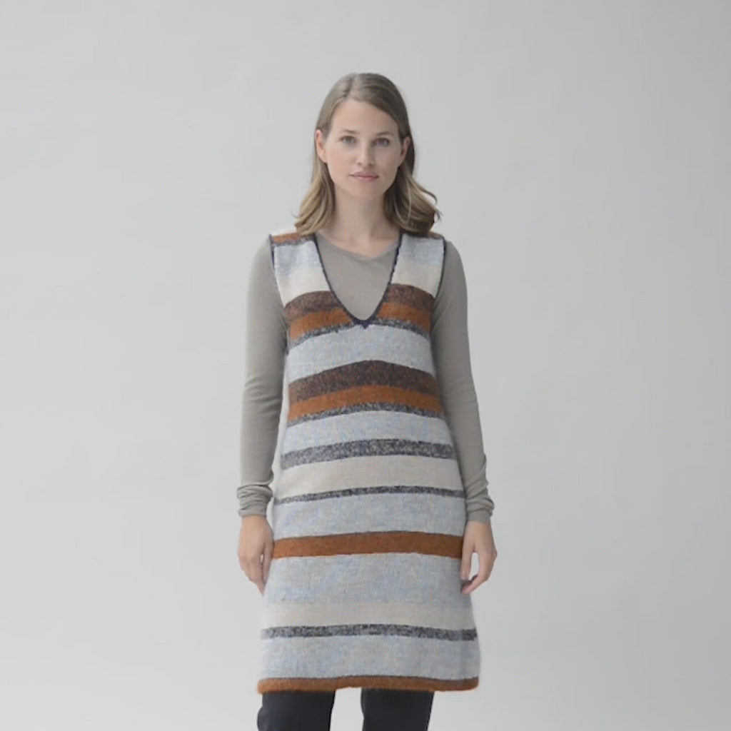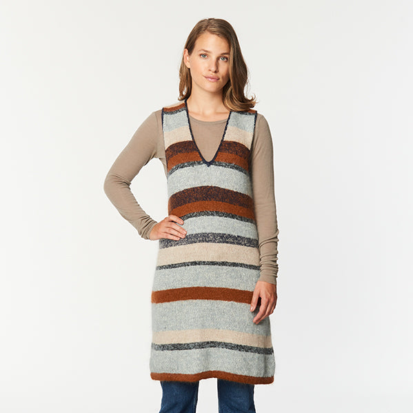 Langøya kombinerer striber med smukke farver i et mix af skønne garnkvaliteter! Denne temakollektion består af følgende modeller: kjole, baret og krave til både damer og piger - samt t-shirt, bluse, knæstrømper og strømper til damer. Langøya er designet af Kit Coutures faste designteam.