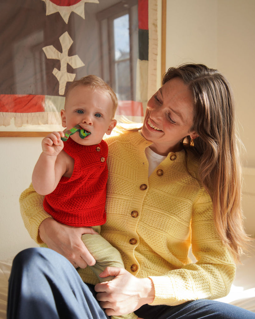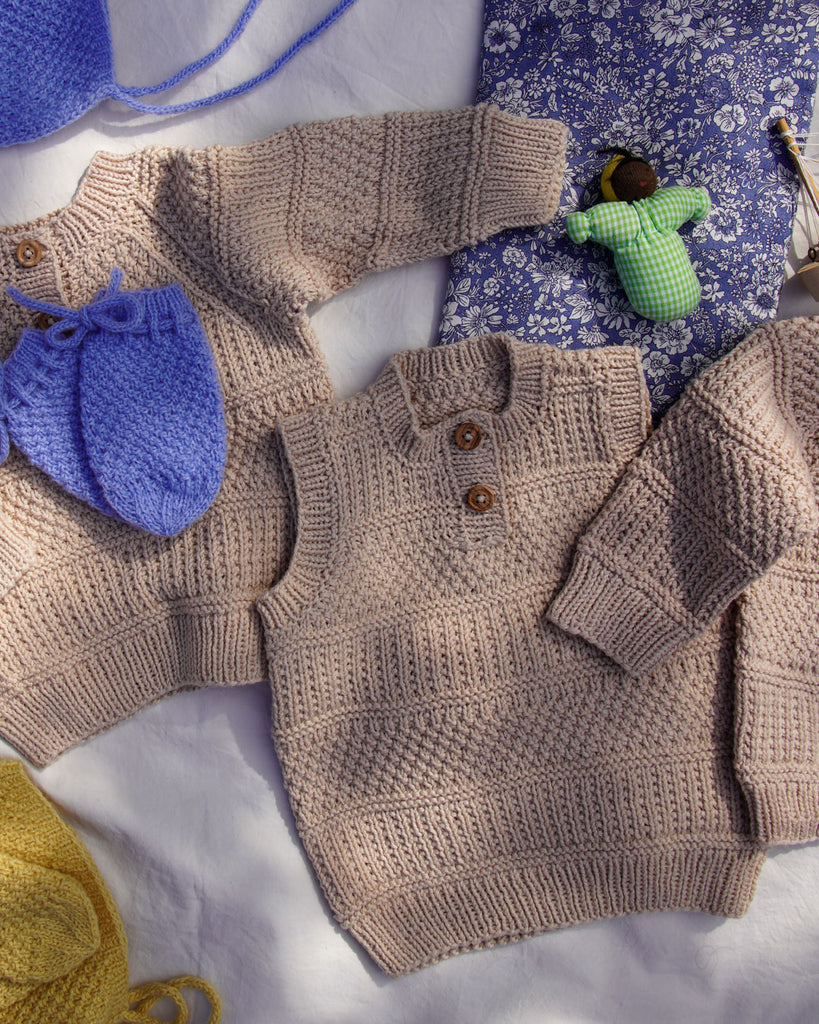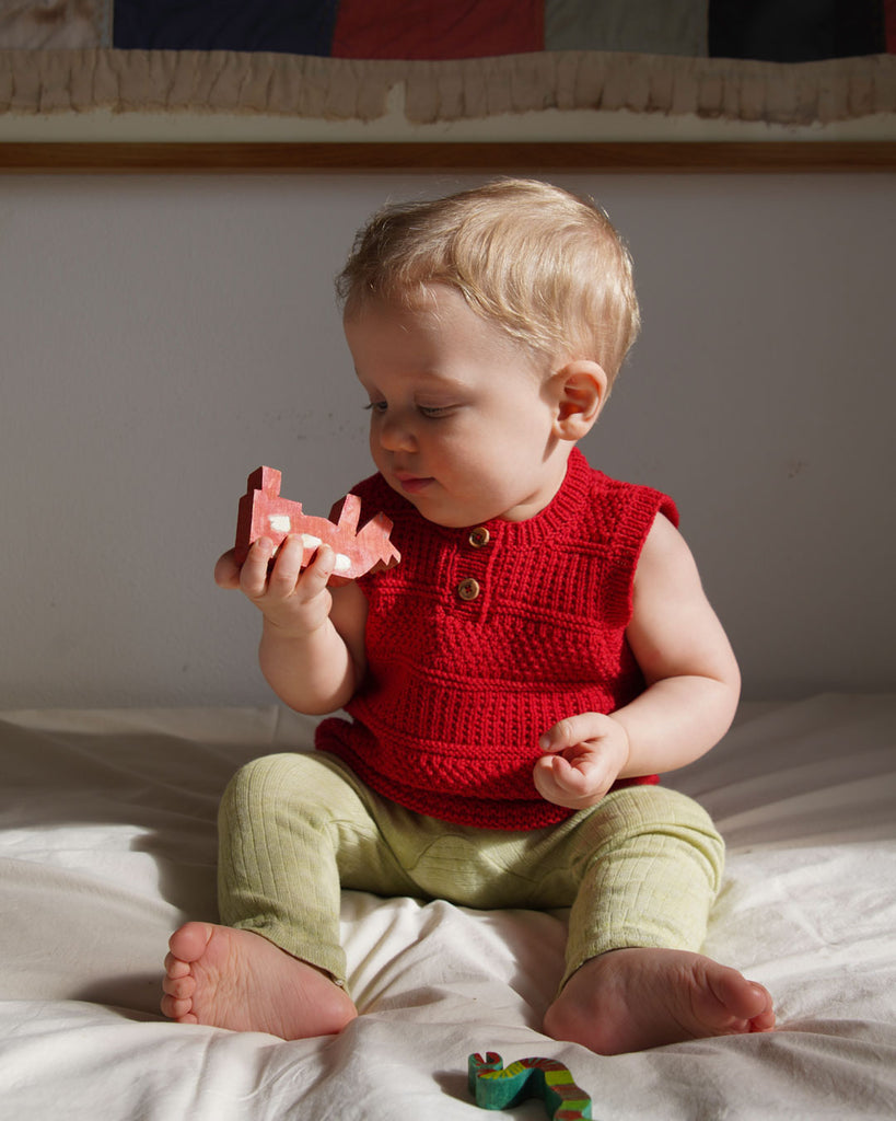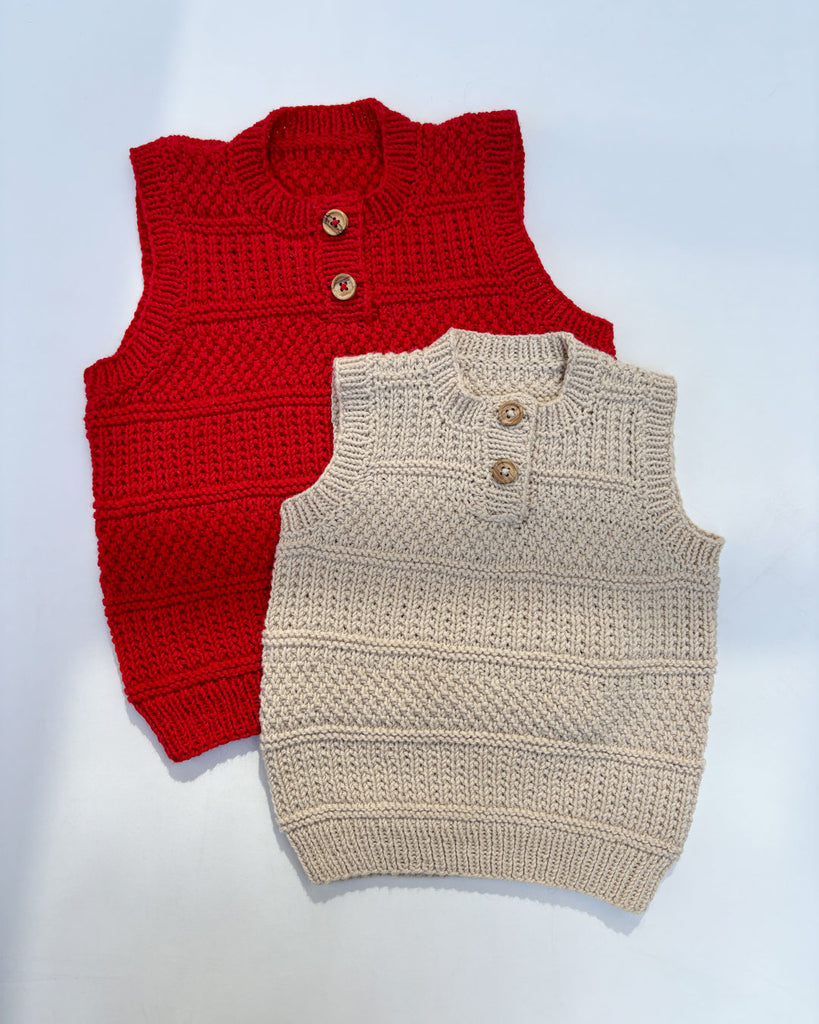 Mykines Vest er perfekt til en lille baby, som skal holde varmen. Vesten har en lille åbning foran med fine træknapper, så vesten er let at få over hovedet. Mykines Vest strikkes i det bløde Wool Cotton garn.