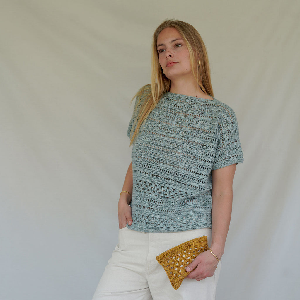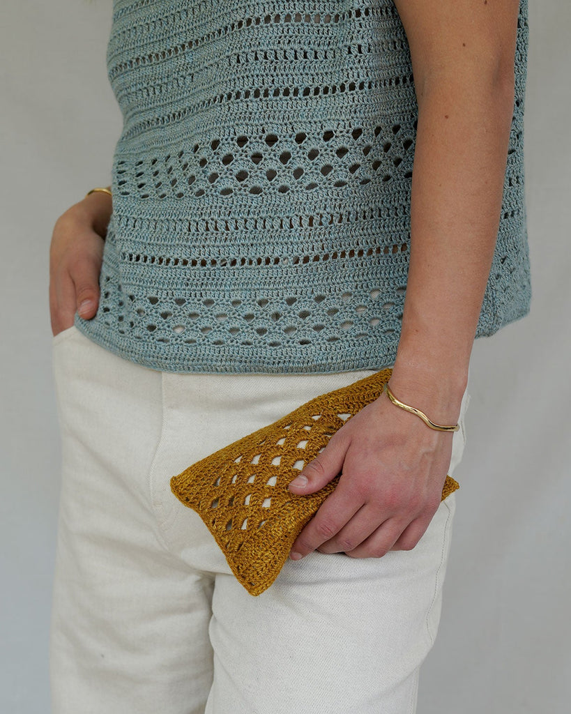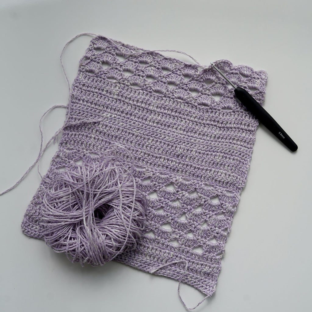 Æbelø Clutch hækles frem og tilbage fra bunden og op. Der hækles striber af vifter og stangmasker. Da Silk Linen er et lidt stift garn før vask, anbefaler vi, at du hækler med en metalhæklenål, så garnet glider bedre på nålen.