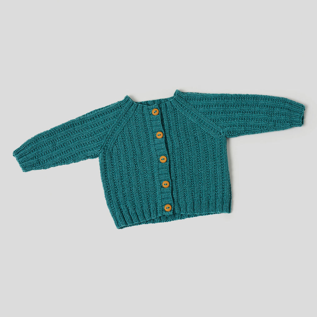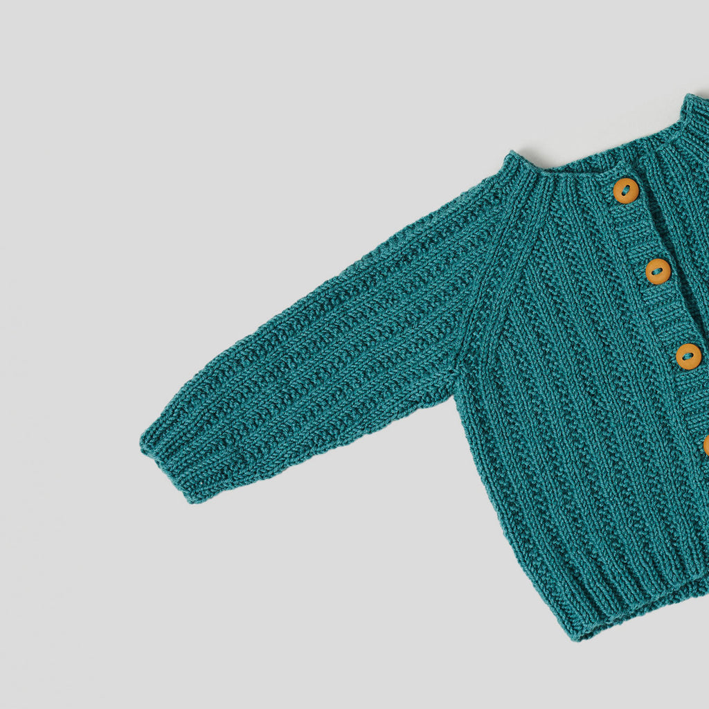 Eldey Cardigan til babyer strikkes nedefra og op i strukturmønster med ret og vrang. Krop og ærmer strikkes hver for sig, hvorefter de samles til bærestykket, der strikkes med raglanindtagninger.